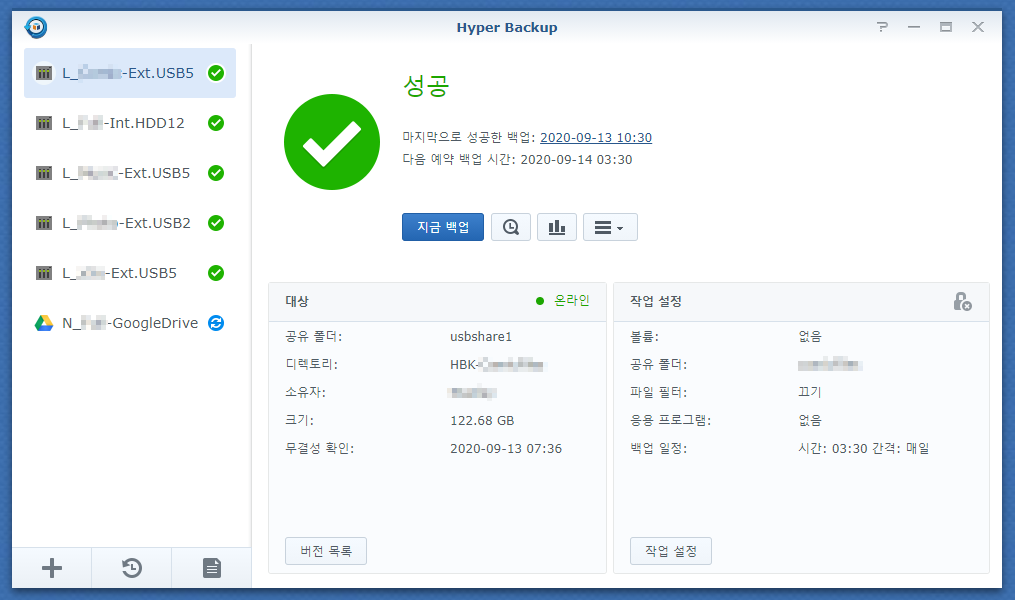 2차 백업용 외장하드는 2.5인치 사이즈의 2TB 1개와 5TB 한개로 하고 있습니다. 2TB 외장하드엔 사진 파일들을, 5TB 외장하드엔 사진 파일을 제외한 필수 자료들을 하루에 한번씩 Hyper Backup으로 증분 백업을 하고 있습니다.
