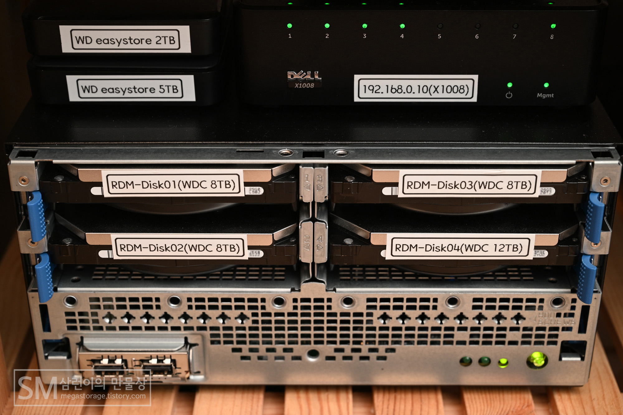 HPE Microserver Gen10 Plus에 들어있는 디스크는 전부 아마존에서 구입한 외장하드에서 적출한 하드디스크들 입니다. 1번 부터 3번 슬롯까지는 8TB, 4번 슬롯엔 12TB가 들어있습니다. 3개의 8TB는 시놀로지의 RAID5로 묶여있고 12TB는 단일 디스크입니다. 8TB*3EA(RAID5)가 메인 자료 드라이브, 12TB는 메인 자료 드라이브의 1차 백업 하드디스크 입니다.