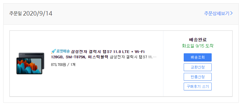 진짜 대 감동이었습니다. 제가 갤럭시 탭을 사용하는 이유가 S Pen이 가장 컸는데, 갤럭시 탭 S7에서 S Pen 성능이 아주 크게 향상 됐습니다. 몇번 좀 만져보다가 집에 가는 도중에도 자꾸 생각났습니다. 살까..? 말까..? 그냥 갤럭시 탭 S6 Lite로 만족할까...? 몇 번, 몇 번을 고민했습니다. 사실 갤럭시 탭 S6 Lite를 구매하기 전에 쿠팡에서 갤럭시 탭 S7의 예약구매를 하려고 했지만... 타이밍을 놓쳐서 위메프고 쿠팡이고 뭐고 다 실패했습니다. 마감되니까 물량이 더 풀리진 않더라구요. 그래서 포기했었는데....... 때 마침, 쿠팡에 들어가보니까 '쿠팡 와우' 회원은 정가에서 55,800원을 할인해줍니다. 예약판매 가격을 이미 봤기 때문에.. 이 돈주고 구입한다는게 너무 속이 쓰렸지만, 이미 한번 강림한 지름신을 보낼 순 없었습니다. 그래서 두 눈 꼭 감고서 질렀습니다.