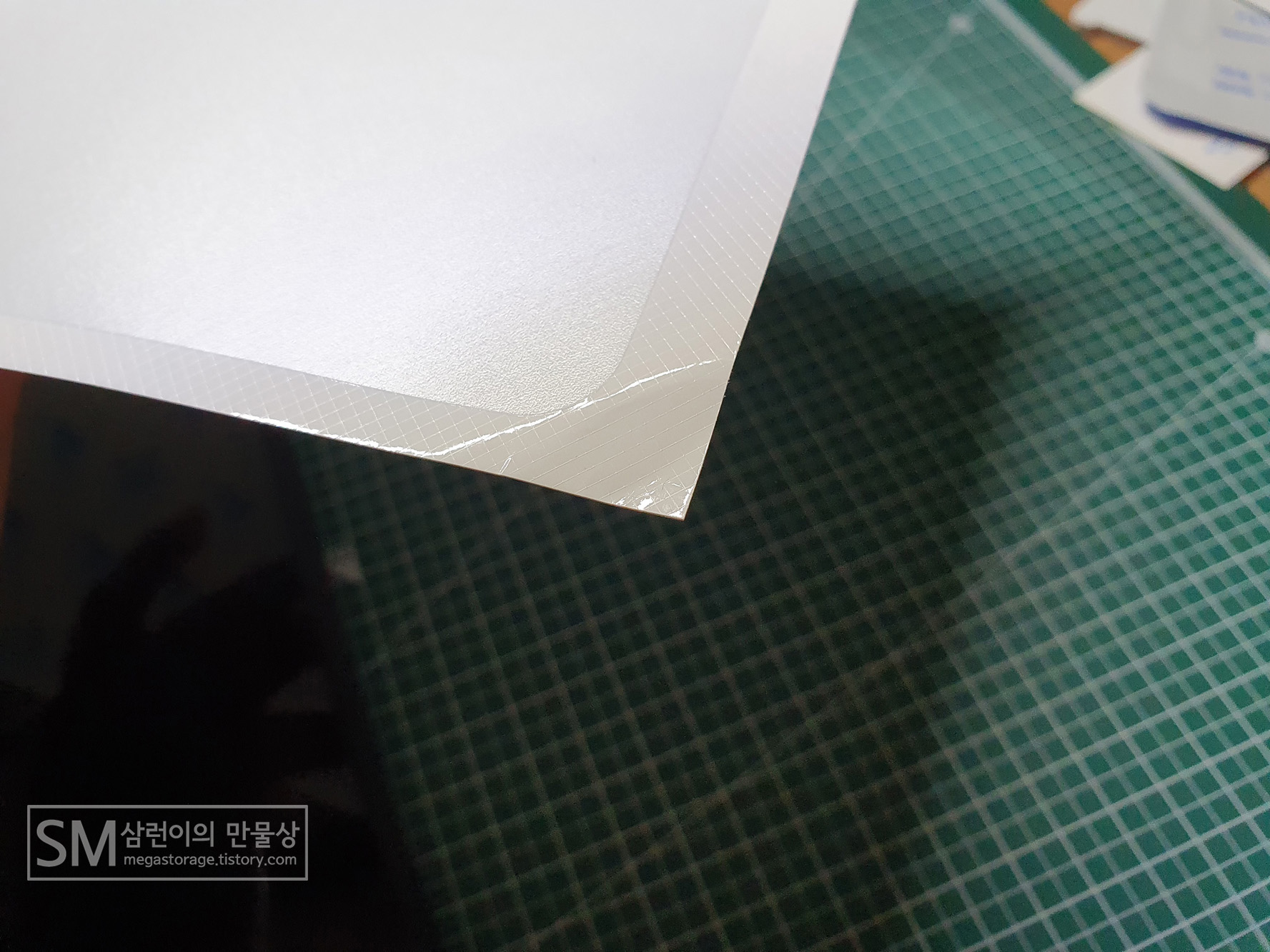 필름도 같이 구겨졌습니다. 맨 마지막은 후면 보호필름인데, 후면 보호필름은 두꺼운 필름이 아니기 때문에 그냥 종이만 구겨져 있습니다. 환장하겠네요. 교환 신청 다시 하려고 했더니 판매자가 교환 물품 발송 정보를 입력을 안해놔서 아직까지도 '교환품 발송 대기' 상태입니다. 전화해서 또 교환받는게 너무 번거롭고 귀찮은 나머지 걍 붙여봤는데...