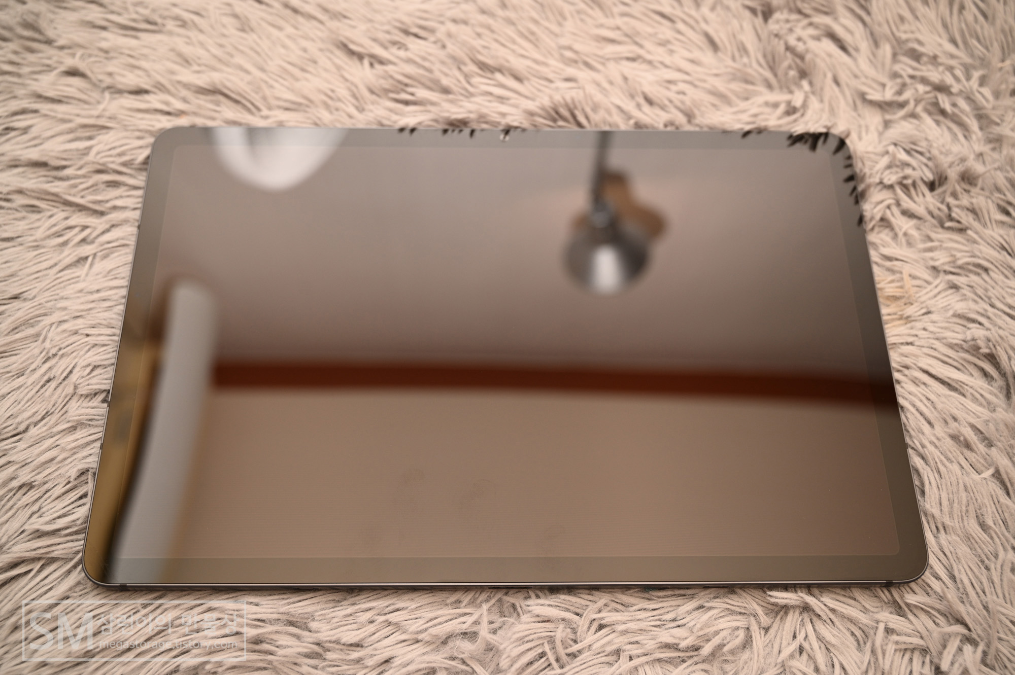 부직포 비닐을 벗겨낸 갤럭시 탭 S7입니다. 기본 보호필름은 부착되어 있지 않습니다. 반사가 꽤 심합니다. 마치 거울 같습니다.