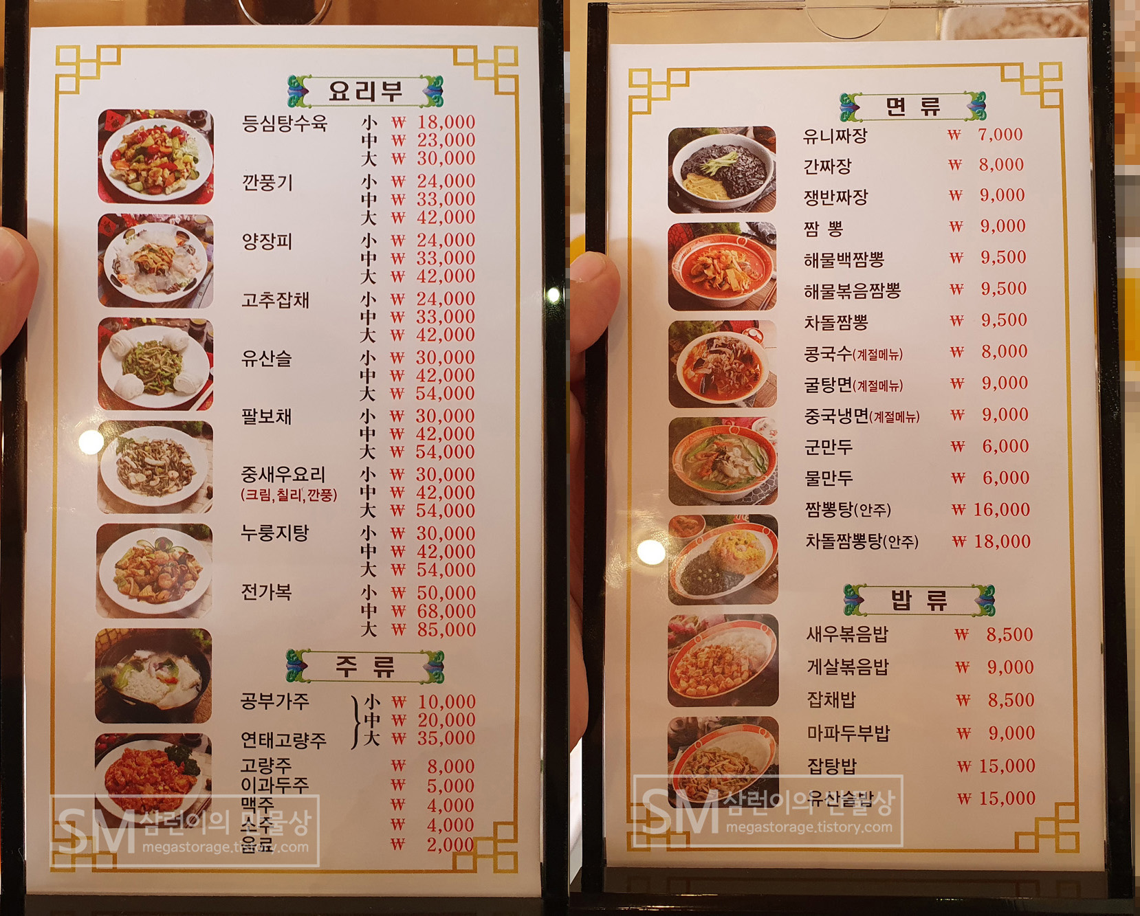 '전국5대짬뽕 연화산'에서 판매 중인 음식 가격은 위와 같습니다. 가격은 평범한 기준에서 살짝 높은 편입니다. 제가 먹은 '차돌짬뽕'은 9,500원이네요. (우측 중앙)