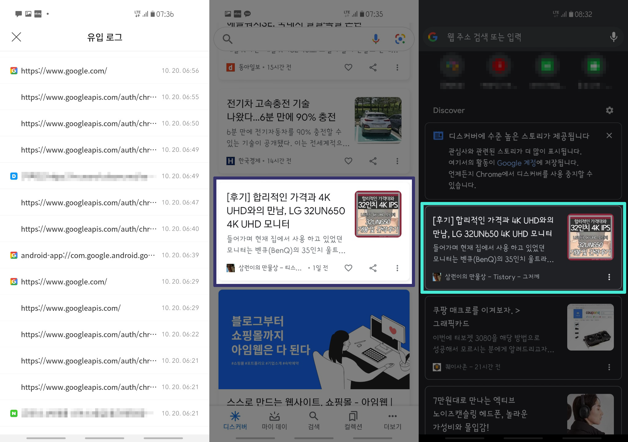 제가 위에 촬영한건 제 폰에서 'Google' 앱과 'Google Chrome'앱의 추천 기사에서 바로 확인할 수 있었습니다. 구글 디스커버는 사용자가 주로 검색하거나 흥미를 가지는 주제와 관련된 내용을 자동으로 추천 및 표시해줍니다. 모니터 또는 전자제품을 좋아하는 다른 분들의 구글 디스커버에 제 블로그 글이 뜬 것이고, 그걸 눌러서 들어오신 것입니다. 근데 한 가지 의문이 생깁니다. 구글 디스커버 화면에는 메이저 커뮤니티나 뉴스 웹페이지 글만 뜨던데, 제 블로그가 여기에 뜨는 건 정말 이상했거든요. 근데 이 의문도 오래가지 않았습니다. 다음날 새로고침 몇 번 해보니까 티스토리 다른 주제의 글이 표시 됐거든요.