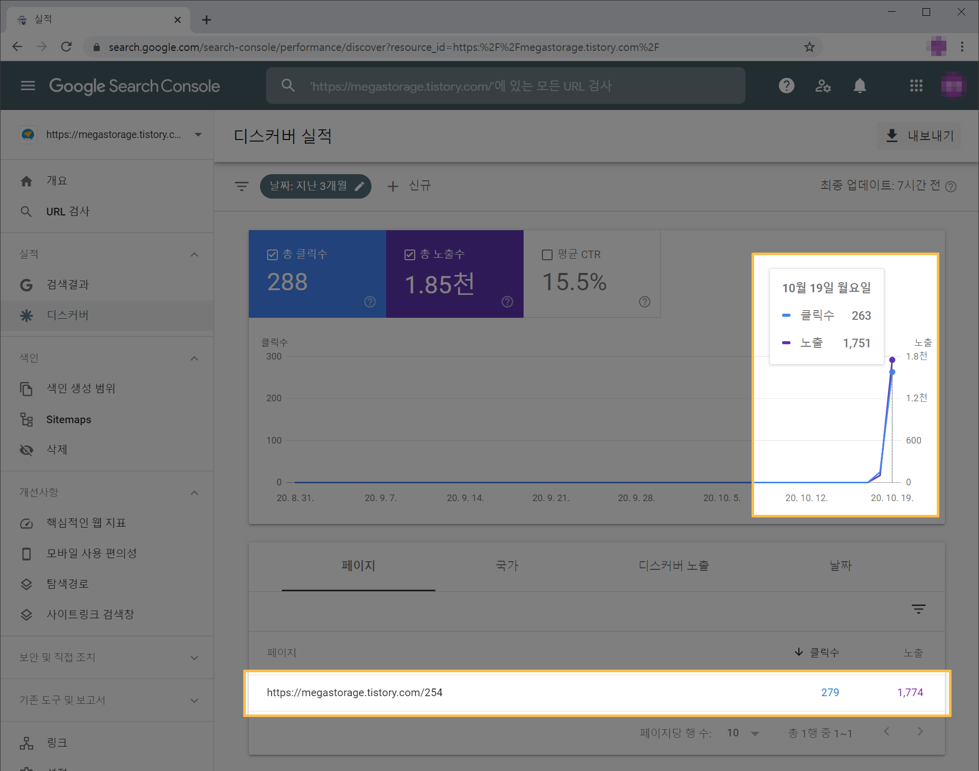 디스커버 항목을 선택하면 '언제', '어느 페이지가', '얼마나 많은 노출' 중에서, '발생한 클릭수'를 확인할 수 있습니다. 32UN650 포스팅 글은 구글 디스커버에 약 1,850회 노출이 되었고, 288분이 제 글을 클릭해서 들어오신 겁니다. 너무나 영광스럽습니다. :)