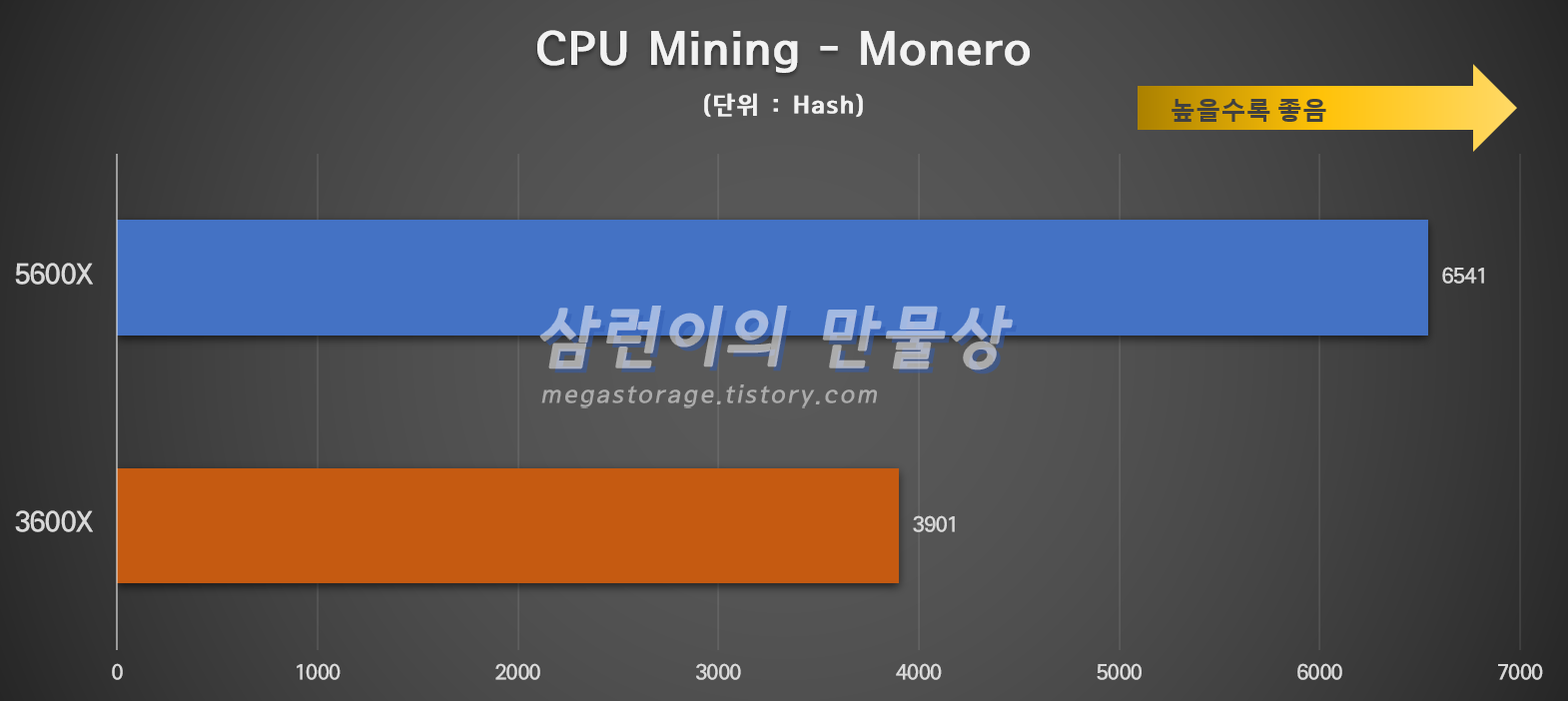 꽤 엄청난 격차를 보였습니다. 3600X는 3,901Hash 였으며 5600X는 6,541Hash 나왔습니다. 5600X는 3600X 보다 67.6% 성능 향상이 있습니다.