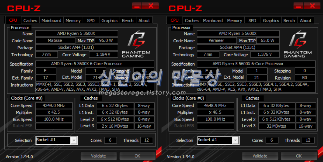 라이젠 3600X(젠 2; Zen 2)과 라이젠 5600X(젠 3; Zen 3)은 아키텍처, 기본 클럭, 부스트 클럭 등등 많은 변화가 있습니다.