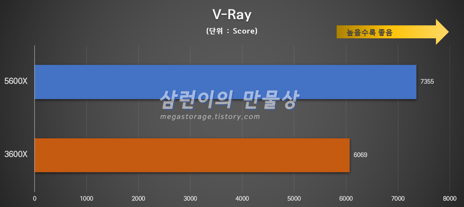 3600X는 6,069점이 나왔으며 5600X는 7,355점이 나왔습니다. 5600X는 3600X 보다 21.1% 성능 향상이 있습니다.