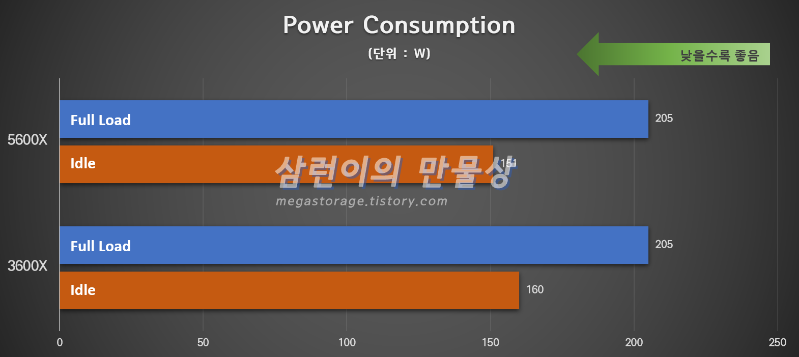 라이젠 5600X이 왜이리 인기가 많은지, 사람들이 왜 라이젠 5600X을 구매하려고 노력하는지 이번 기회에 알게 되었습니다. 동일한 전력 소모로 꽤 인상 깊은 성능 향상이 있습니다. 3600X와 비교했을때 이정도인데, 2000 시리즈나 1000 시리즈를 사용하시는 분들은 정말 엄청난 성능 향상이 있을 것이라 생각됩니다.