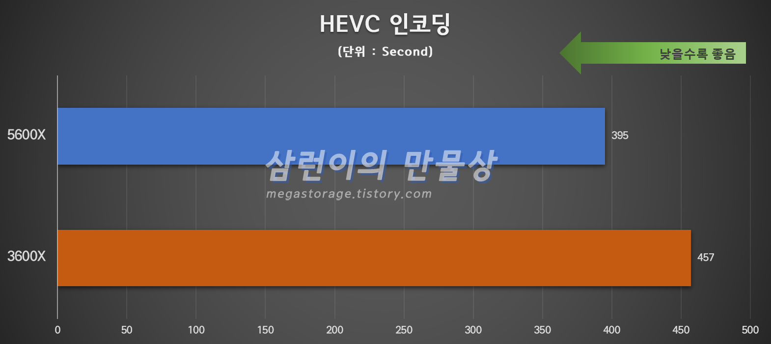 3600X는 7분 37초(0.7x) 걸렸으며 5600X는 6분 35초(0.809x) 걸렸습니다. 5600X는 3600X 보다 12% 더 빠르게 인코딩을 끝냈습니다.