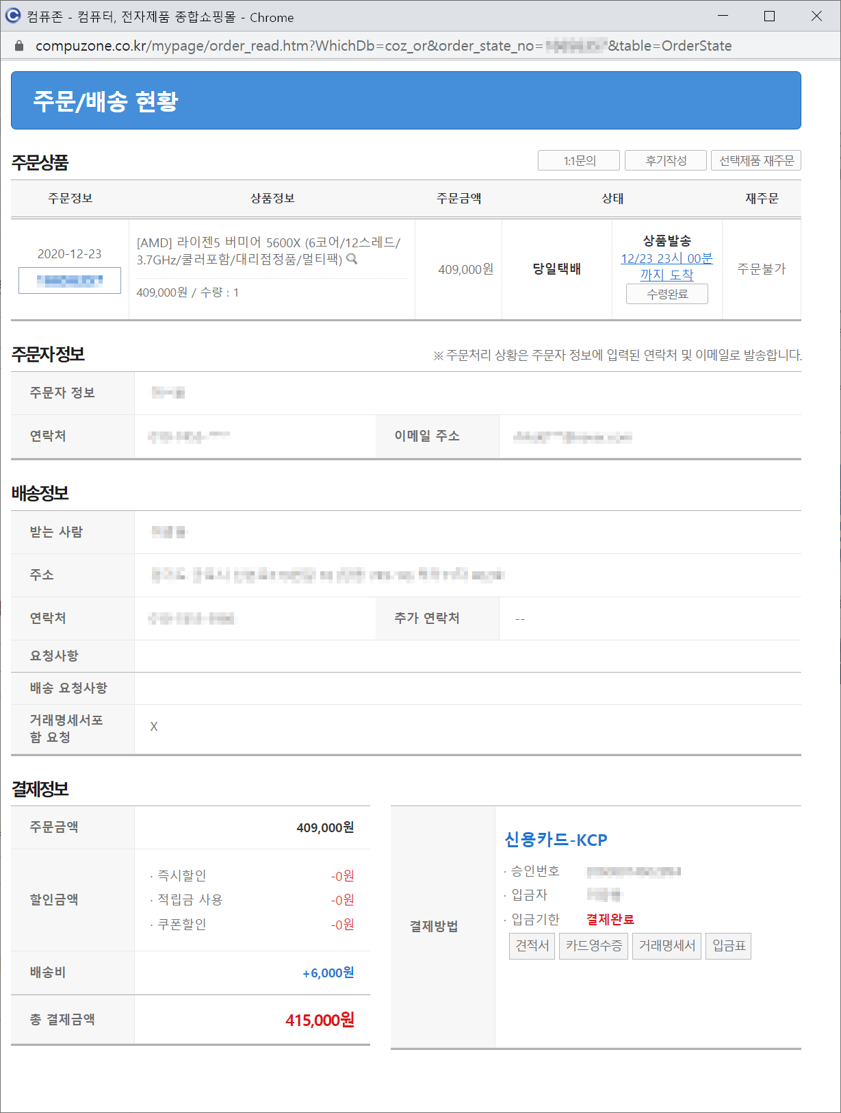 출근길 버스를 기다리면서 폰을 보는 도중에 알림을 받았기 때문에 아주 빠른 구매를 할 수 있었습니다. 5600X의 가격은 409,000원이었고, 일반 택배로 받으면 +2,500원이었지만 크리스마스라는 연휴와 택배가 하루 이상 더 걸릴 수 있으므로 '당일택배'를 신청했습니다. 경기도 군포시 기준으로 당일택배 가격은 +6,000원 입니다.
