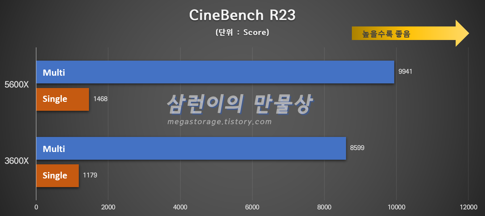 위에서 진행한 7개의 테스트 결과를 종합하면 아래와 같습니다. (라이젠 5600X 기준)