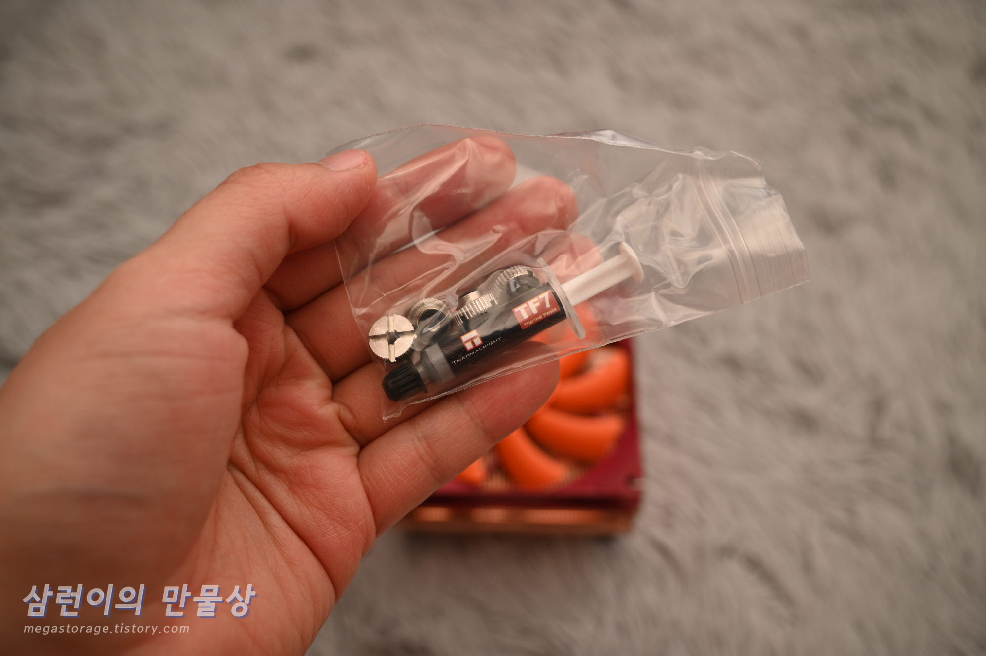 CPU 쿨러 고정 나사 4개와 써멀구리스가 있습니다.