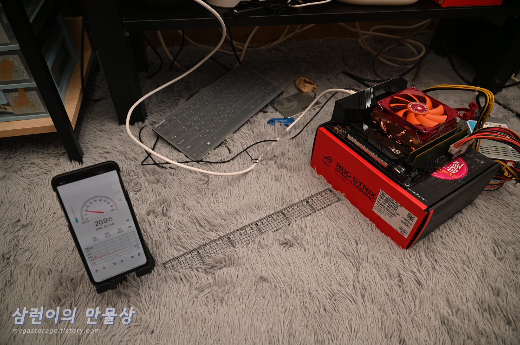 각각 인텔 초코파이 번들쿨러와 Thermalright AXP-90I FULL 쿨러의 소음 측정 장면입니다.