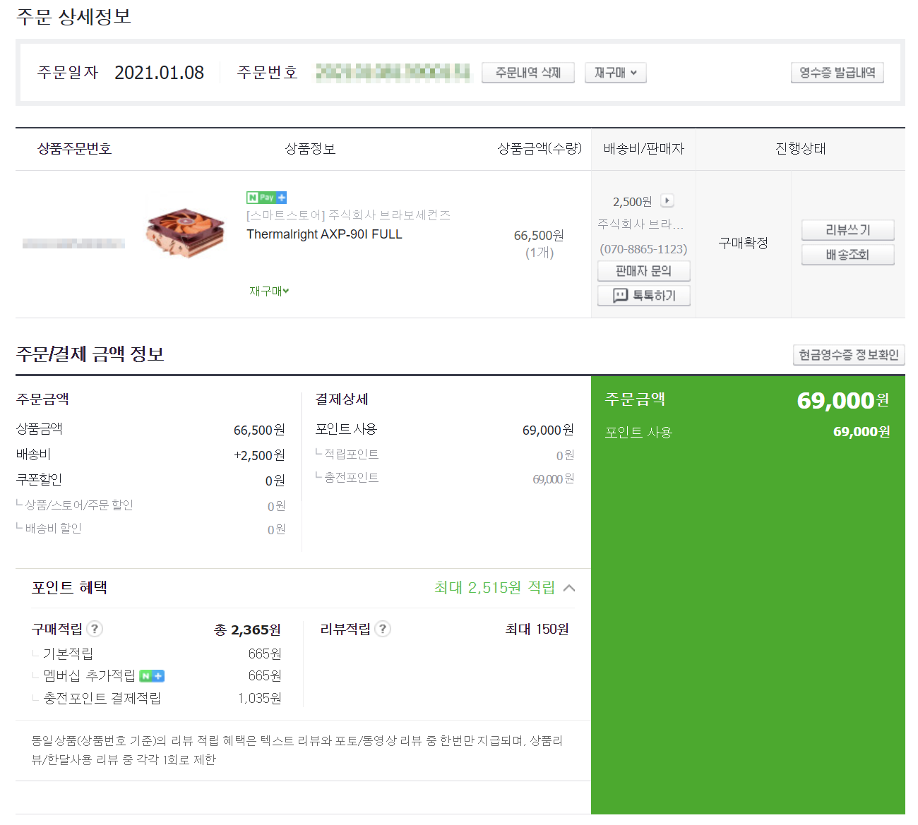 69,000원 결제했으며 적립 포인트 생각하면 실 구매가는 약 66,500원 정도 됩니다.