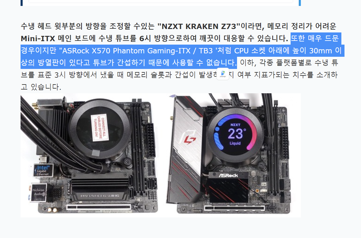 램이랑 간섭이 발생합니다. 아니 이게 뭔 상황이죠? 4방향 모두 간섭이 발생해서 설치가 불가능해졌습니다.. ㅜㅜ 예전에 이 메인보드에서 NZXT 크라켄 X52를 설치 했었는데.. Z63은 더 커졌나봐요. 설치가 불가합니다. 제가 뭔가 잘못한게 있을것 같아서, 구글링을 해봅니다. 그리고 구글에서 찾은 글 하나가 확인사살을 해줍니다.