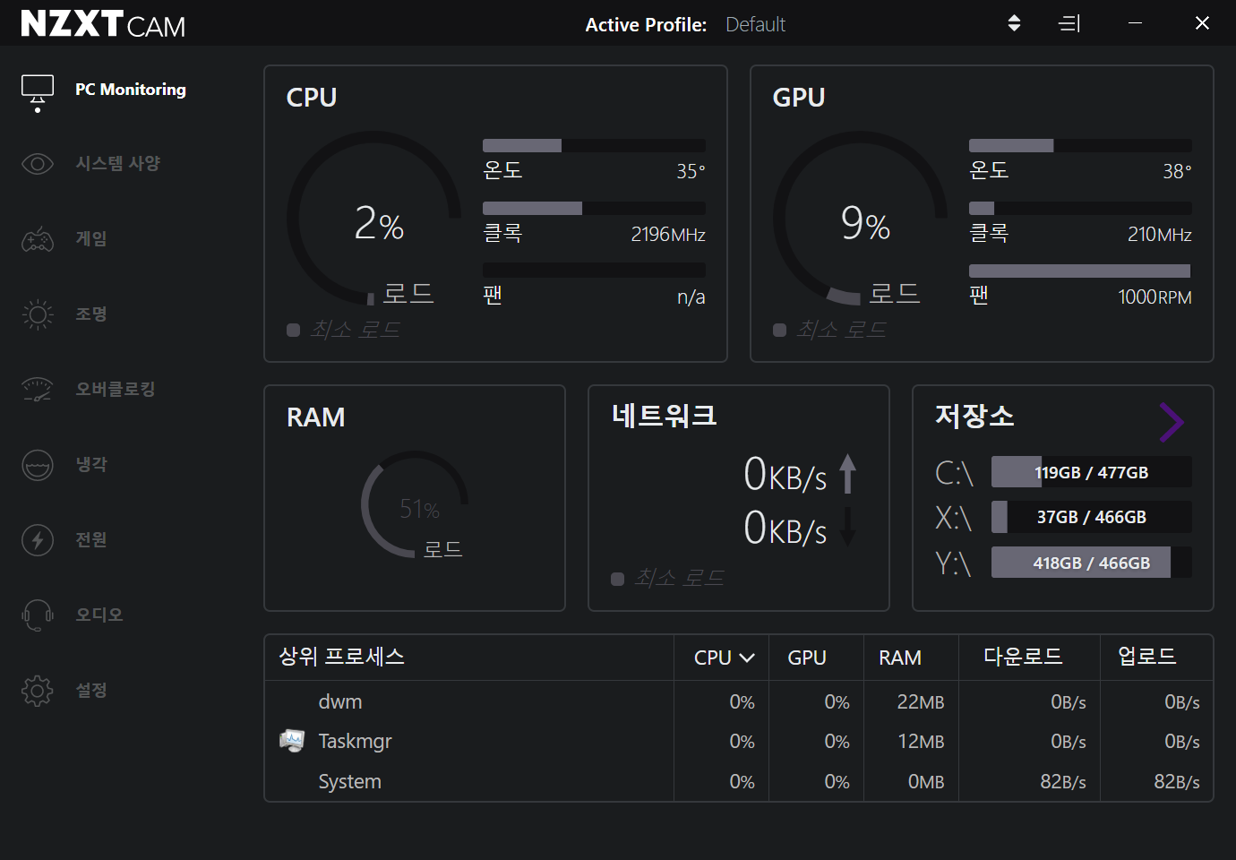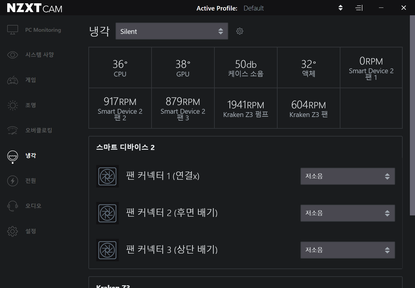 NZXT CAM이 많이 안정화 됐습니다. 예전에 X52 쓸땐 NZXT CAM 유틸리티가 불안정해서 짜증이 났는데, 지금은 꽤 좋아졌습니다.