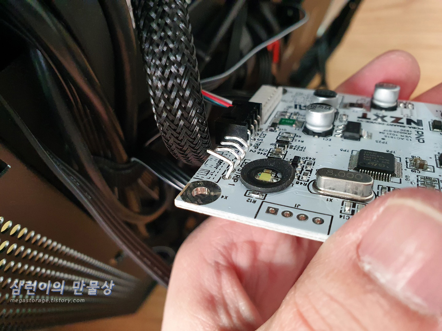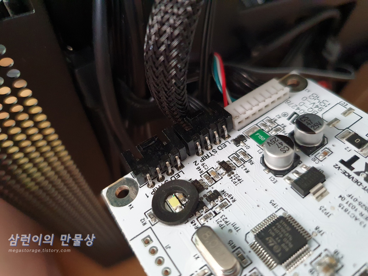 위 사진처럼 챡!! 하고 붙습니다. 철제면에 바로 달라붙어요. 이제 LED/팬 컨트롤러와 워터펌프의 USB 연결 문제는 해결 됐습니다.