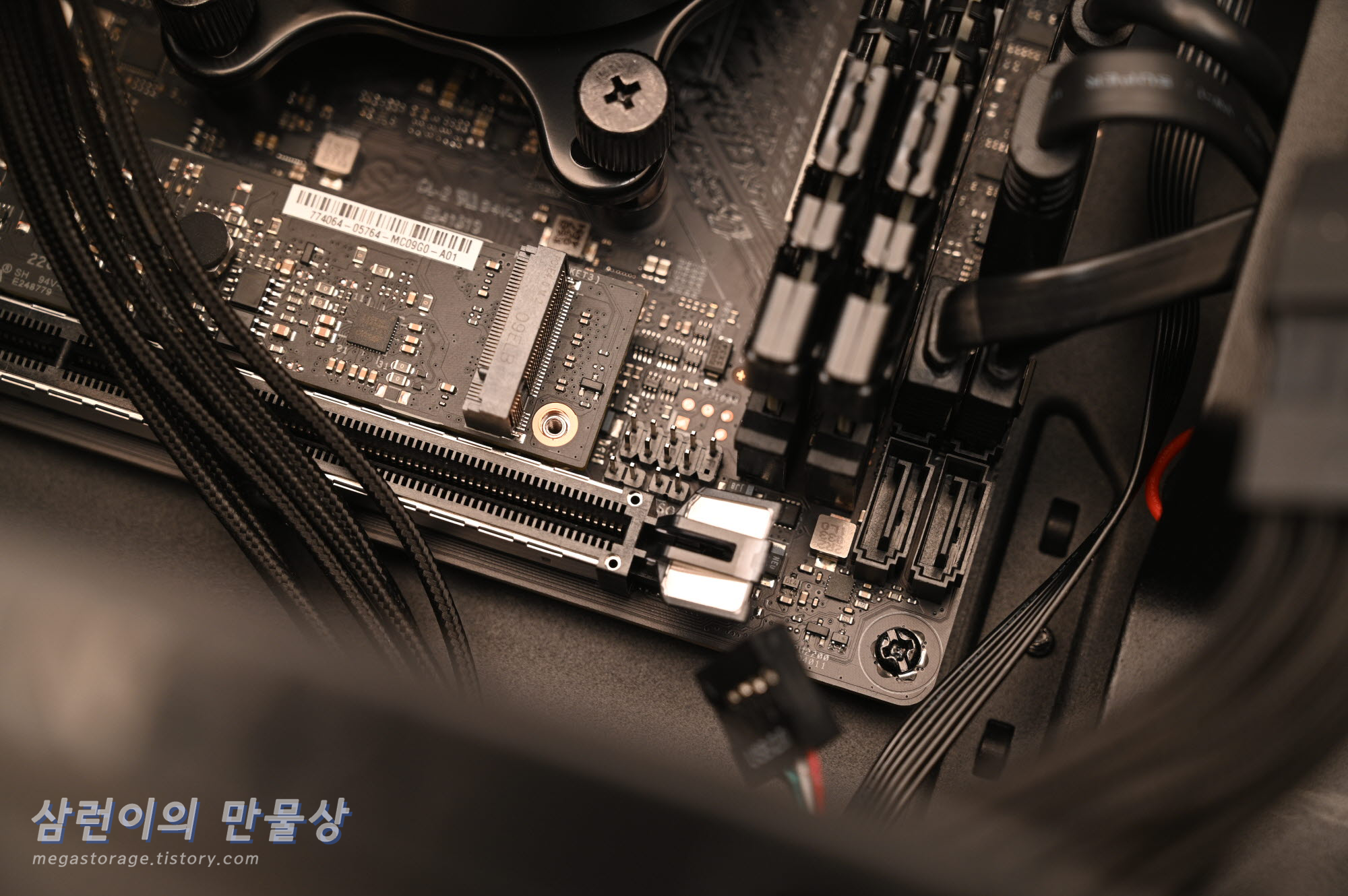 메인보드는 정말정말 깔끔한 디자인을 가지고 있습니다. 전면에 NVME 슬롯+방열판이 있고 SATA 포트 4개, USB 3.0 핀헤더와 USB 3.0 Type-E 포트가 눈에 띕니다.
