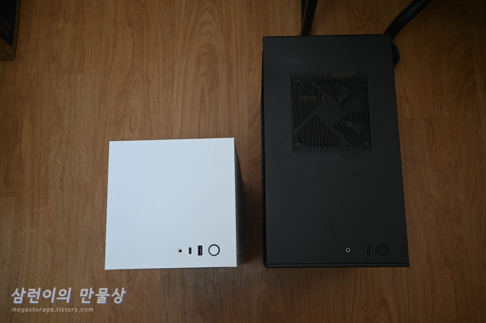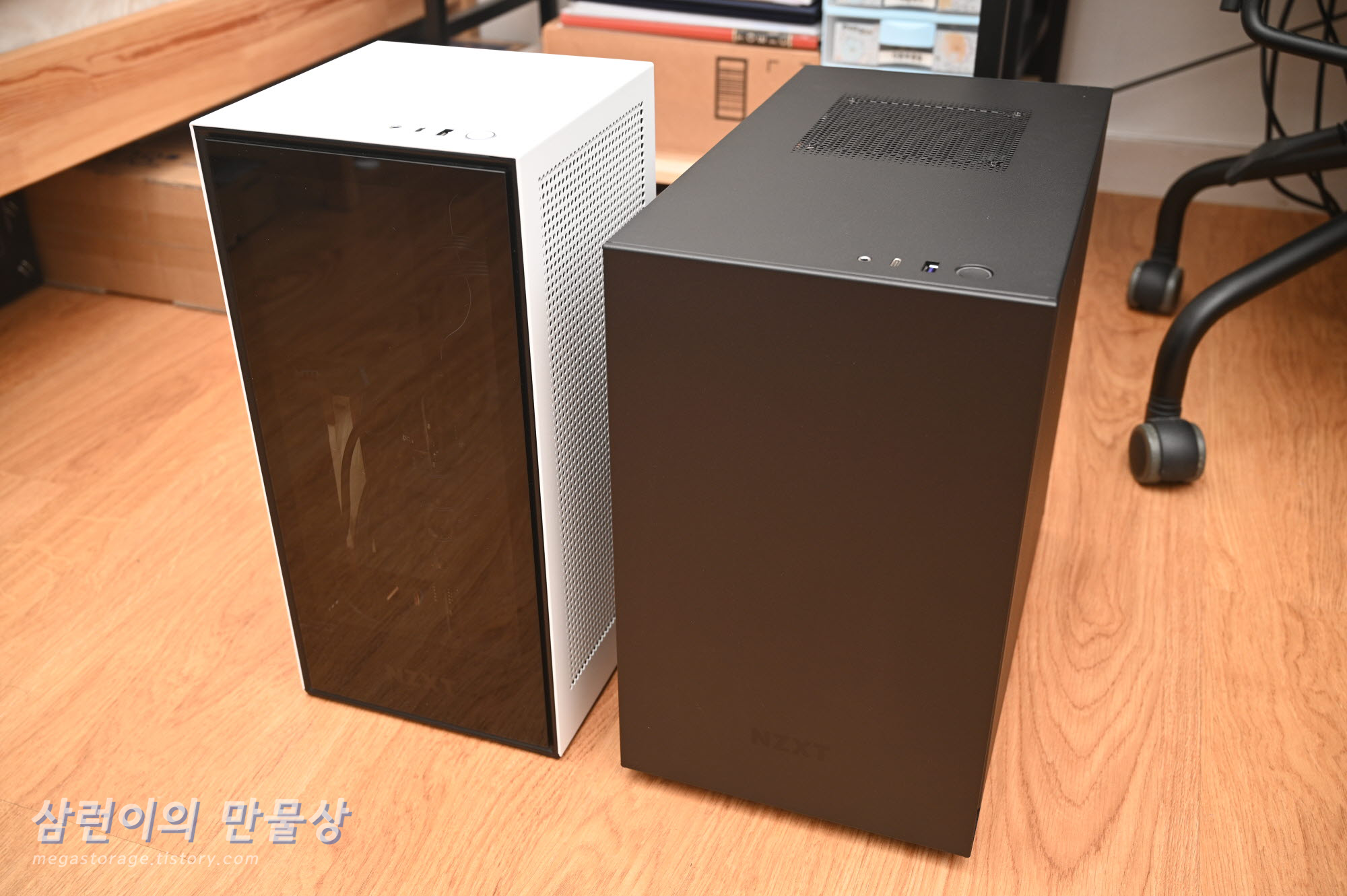 좌측은 기존에 사용 중이었던 NZXT H1이며, 우측은 이번에 새로 구입한 NZXT H210i 입니다. H1 케이스가 일반적인 중형 ITX 케이스보다 높지만 깊이(뒤쪽 길이)가 꽤 짧습니다. 세로로 세워놓은 타워형 케이스이기 때문입니다.