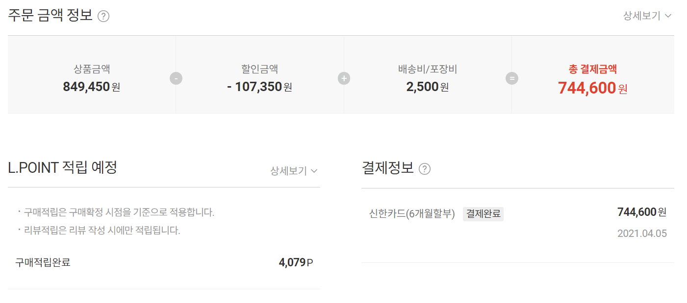 NZXT H210i 케이스는 195,030원 + 배송비 2,500원을, NZXT 크라켄 Z63과 커세어 SF750 파워를 각각 325,410원과 221,660원을 줘서 최종 744,600원을 주고 구입했습니다.