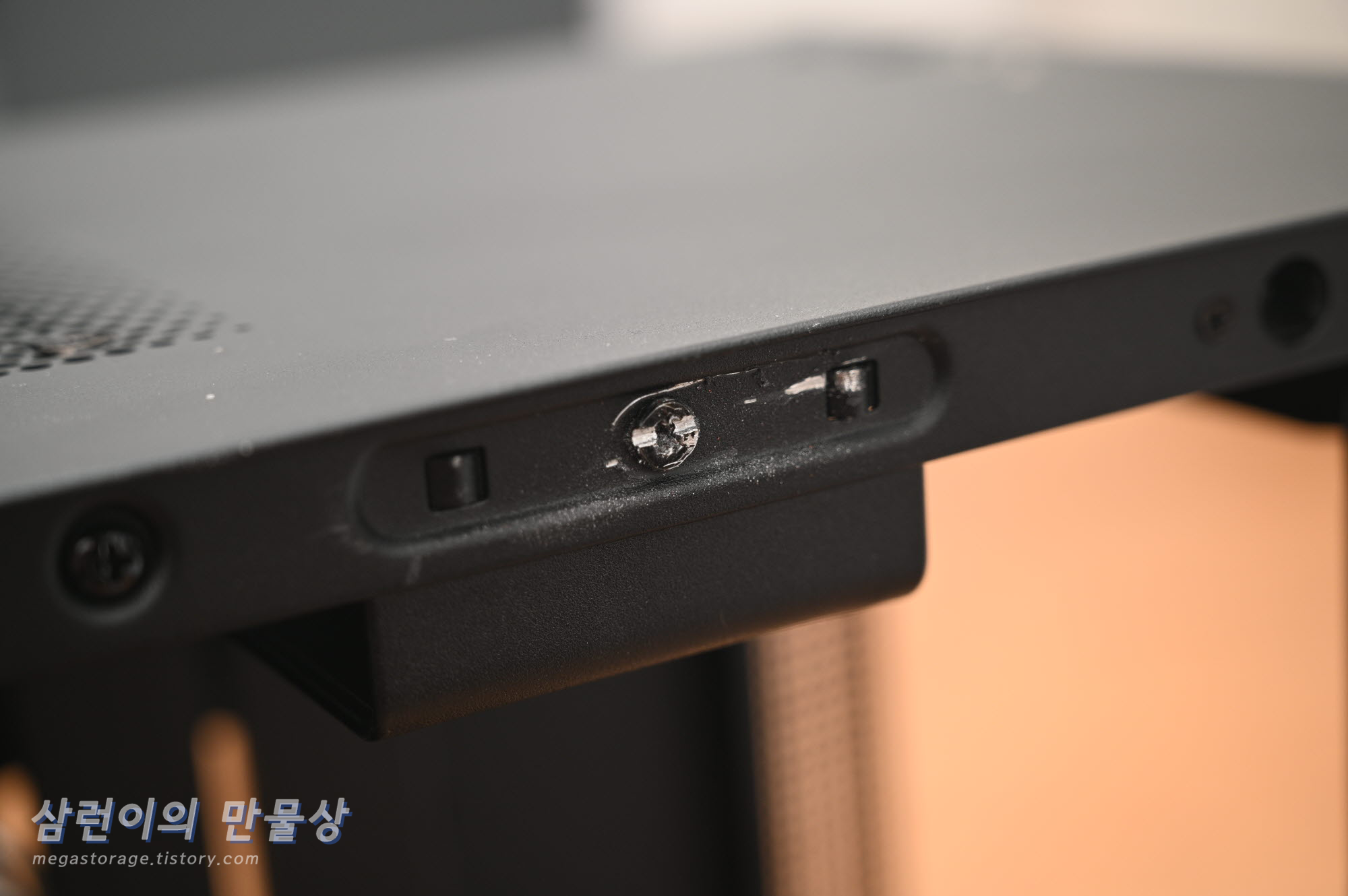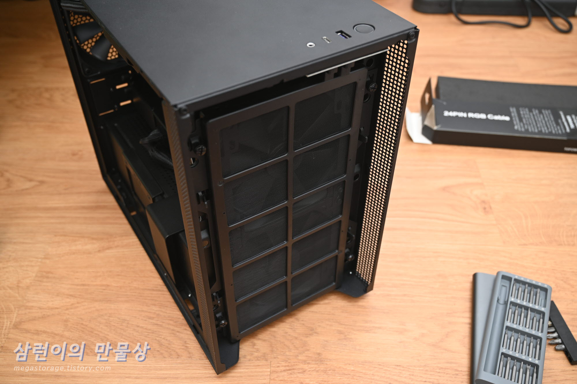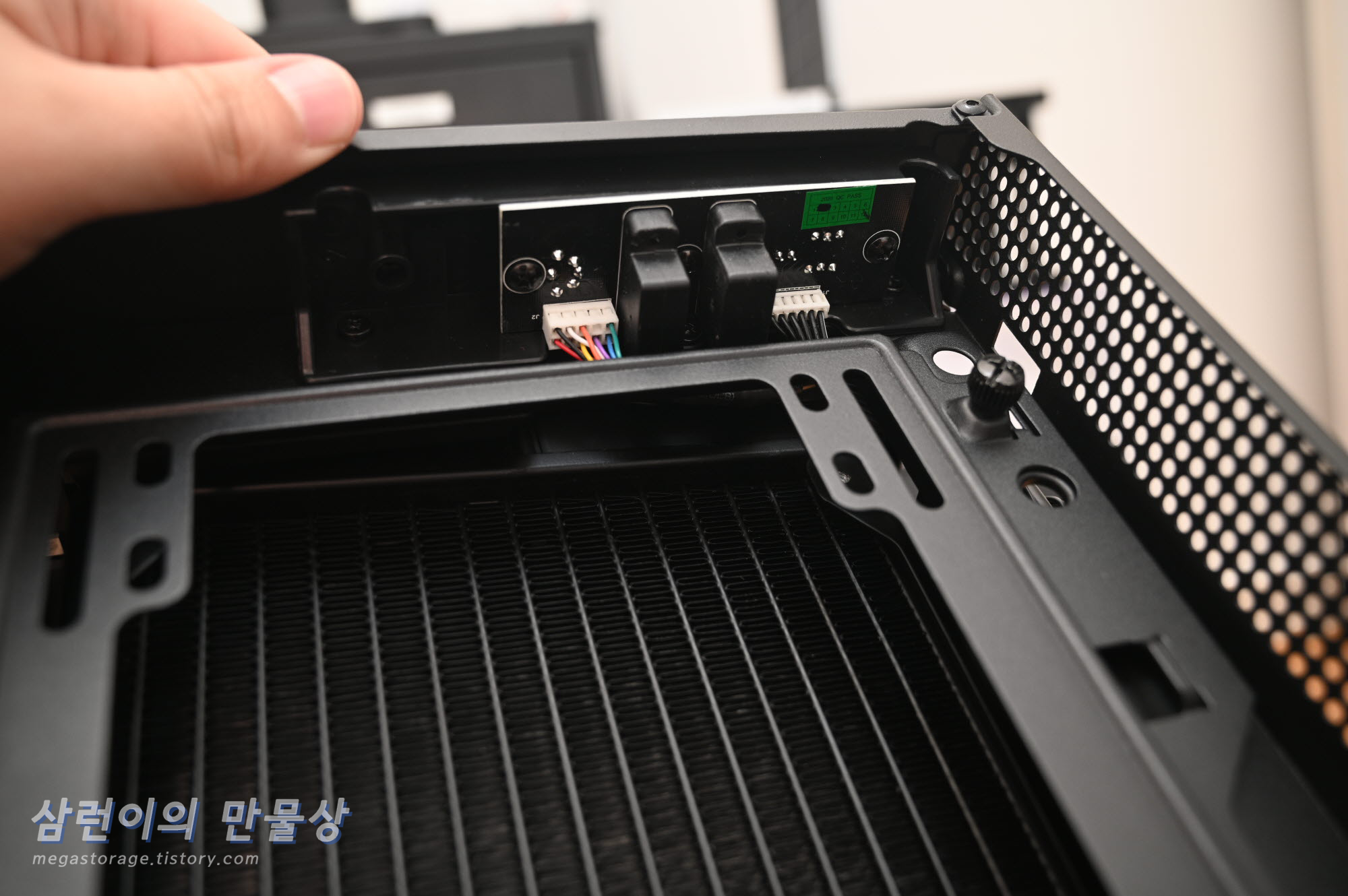 상단 포트들 때문에 라디에이터가 걸려서 앞으로 나오지 않습니다. 그래서 케이스 내부의 선정리용 프레임을 분리해야 합니다.