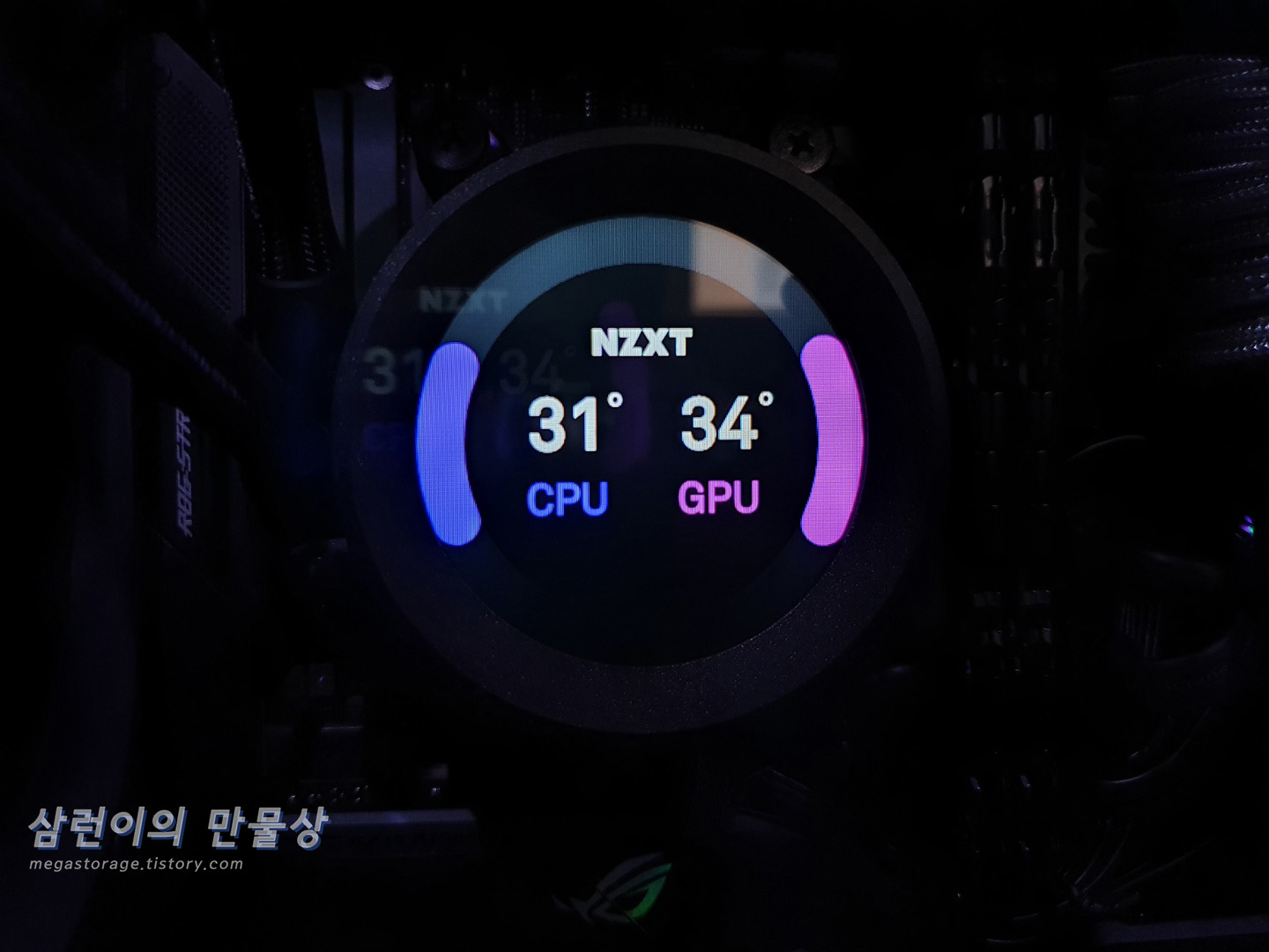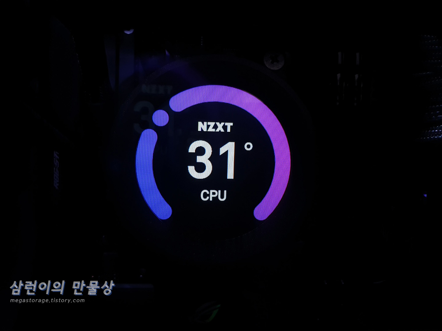 메인보드를 교체했으므로 윈도우를 새로 설치해야 하지만, 정상 동작 확인이 우선이므로 바로 부팅을 시도합니다. 다행히 잘 켜집니다. NZXT CAM 초기 설정이 없을 경우엔 Z63 워터펌프의 LCD 화면도 초기 상태입니다. NZXT CAM을 설치한 후 조절을 해주면 됩니다.