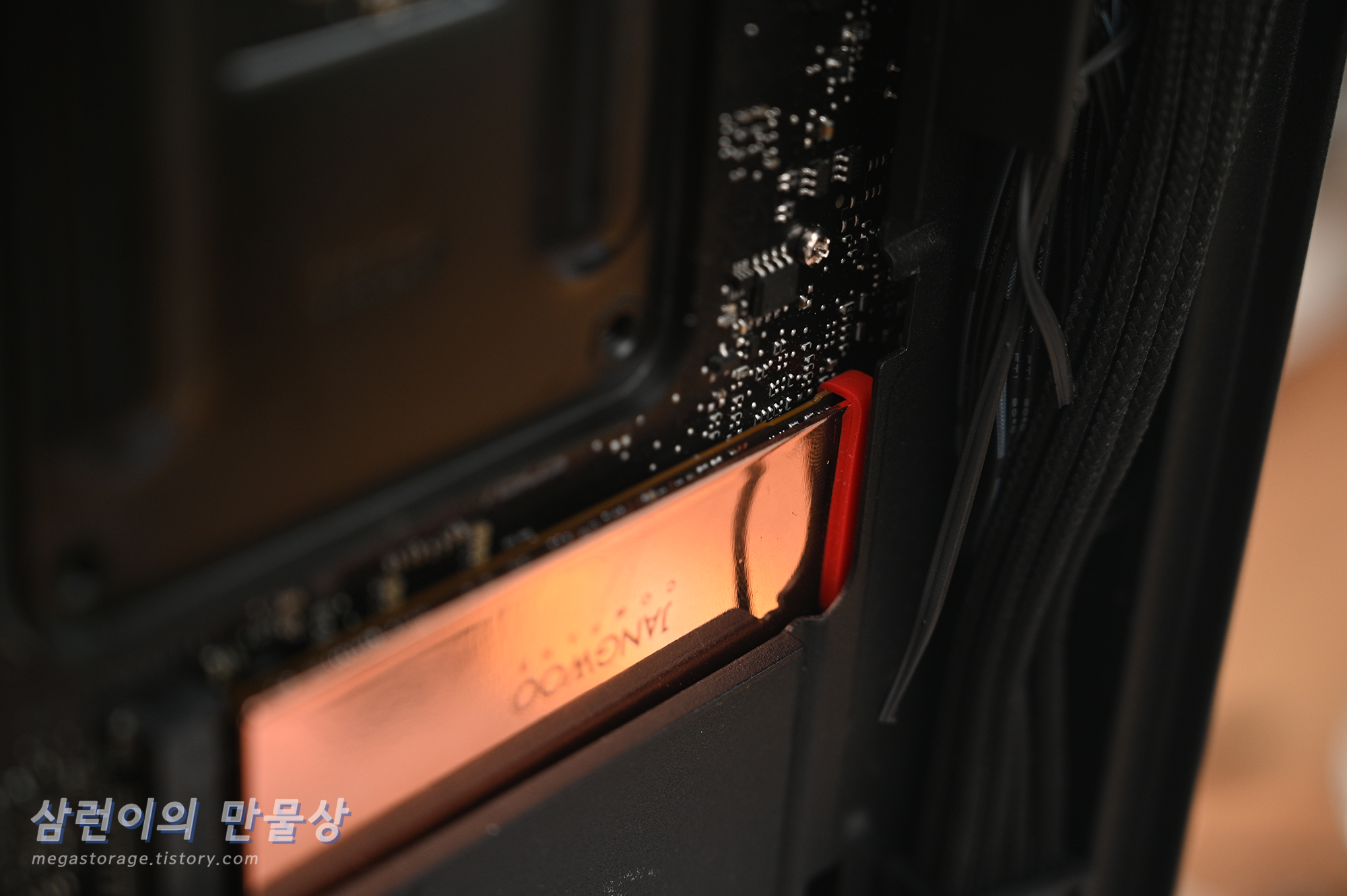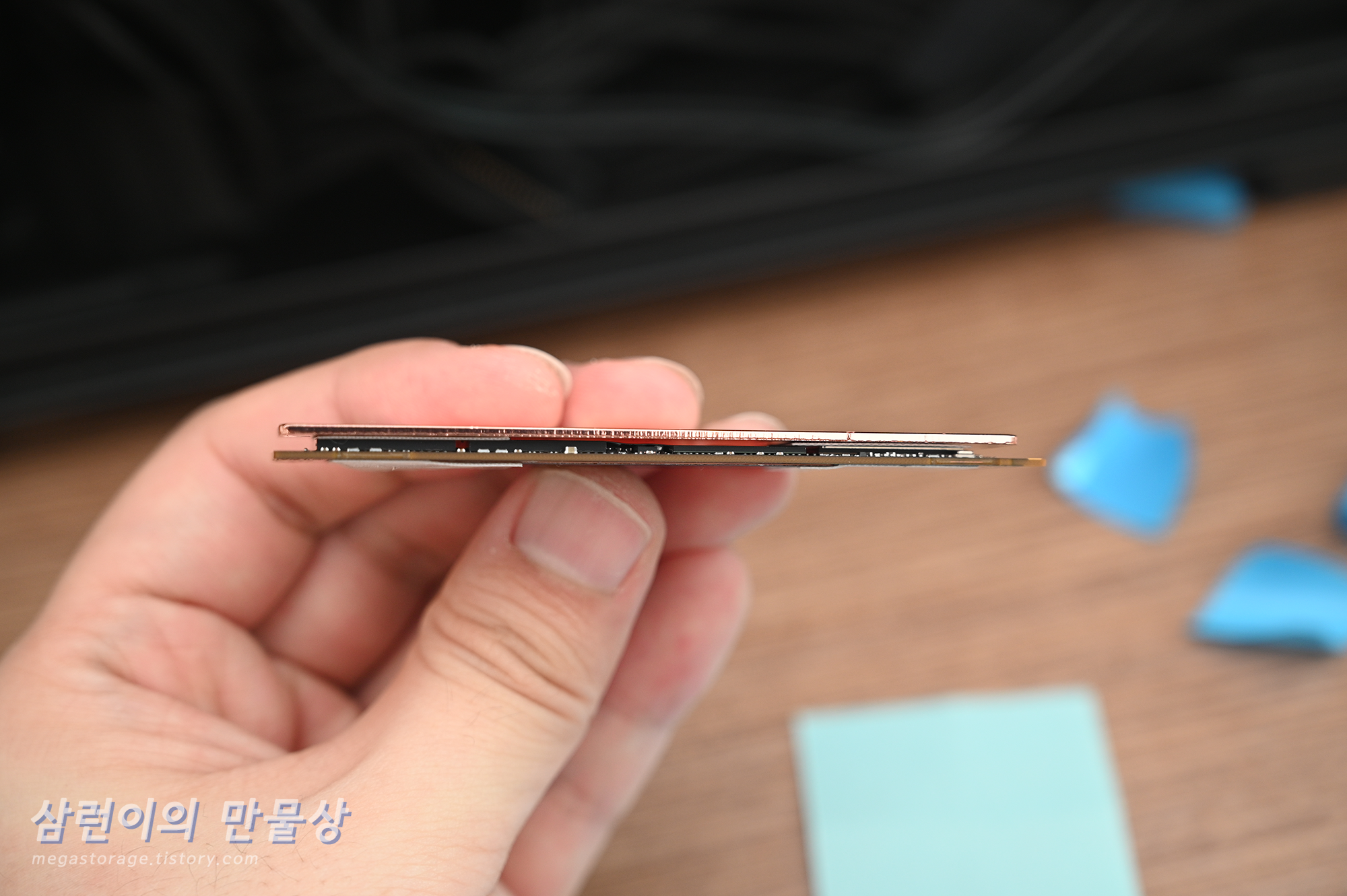 어... 그런데, 두께가 두꺼워서 장착이 안됩니다. 정확하게는 SSD가 끝까지 안들어갑니다. 메인보드 분리 후 장착하더라도 SSD가 짓눌린 상태가 될 것 같은 느낌입니다.
