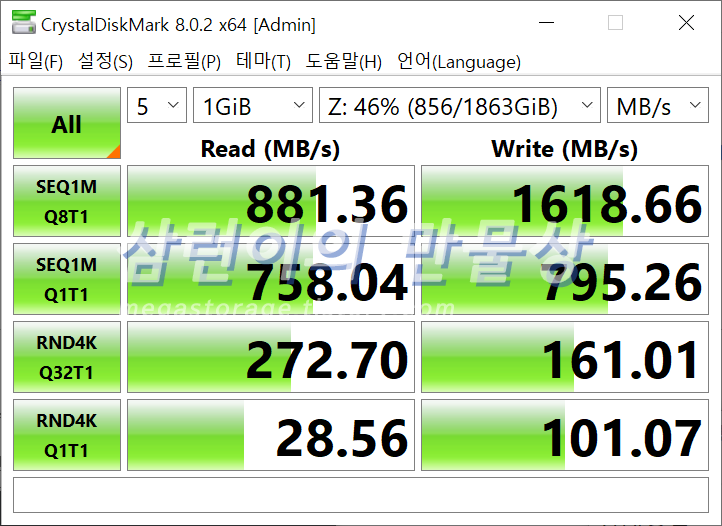 위 측정결과는 '삼성 970 Pro 512GB' 입니다. 자료가 어느정도 차 있는 상태입니다.