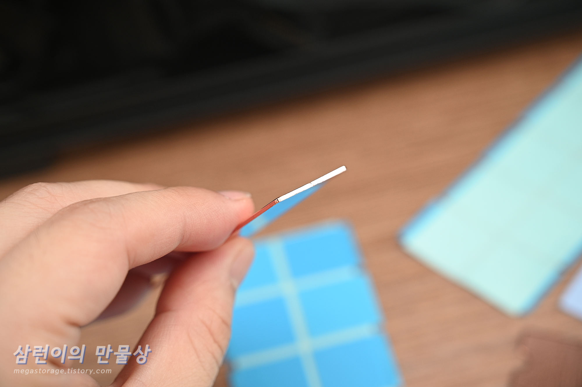 동봉된 플라스틱 헤라로 잘 펴줍니다. 써멀라이트 TFX 써멀구리스는 점성이 있는게 아니라 지점토 수준입니다. 정말 잘 안 펴지면서 플라스틱 헤라에 다 묻어버리네요. 바르는게 힘듭니다.