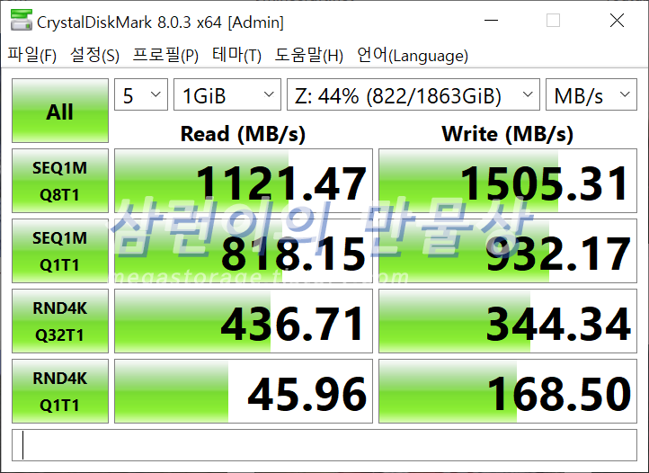 NTFS 으로 포멧을 한 후 아무 데이터를 넣지 않은 상태에서 Crystal Disk Mark 으로 읽기/쓰기 속도 테스트를 확인합니다.