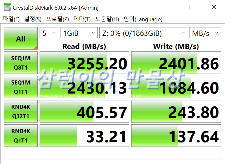 시퀀셜 읽기 약 3255MB/s, 시퀀셜 쓰기 약 2401MB/s 측정되었습니다.