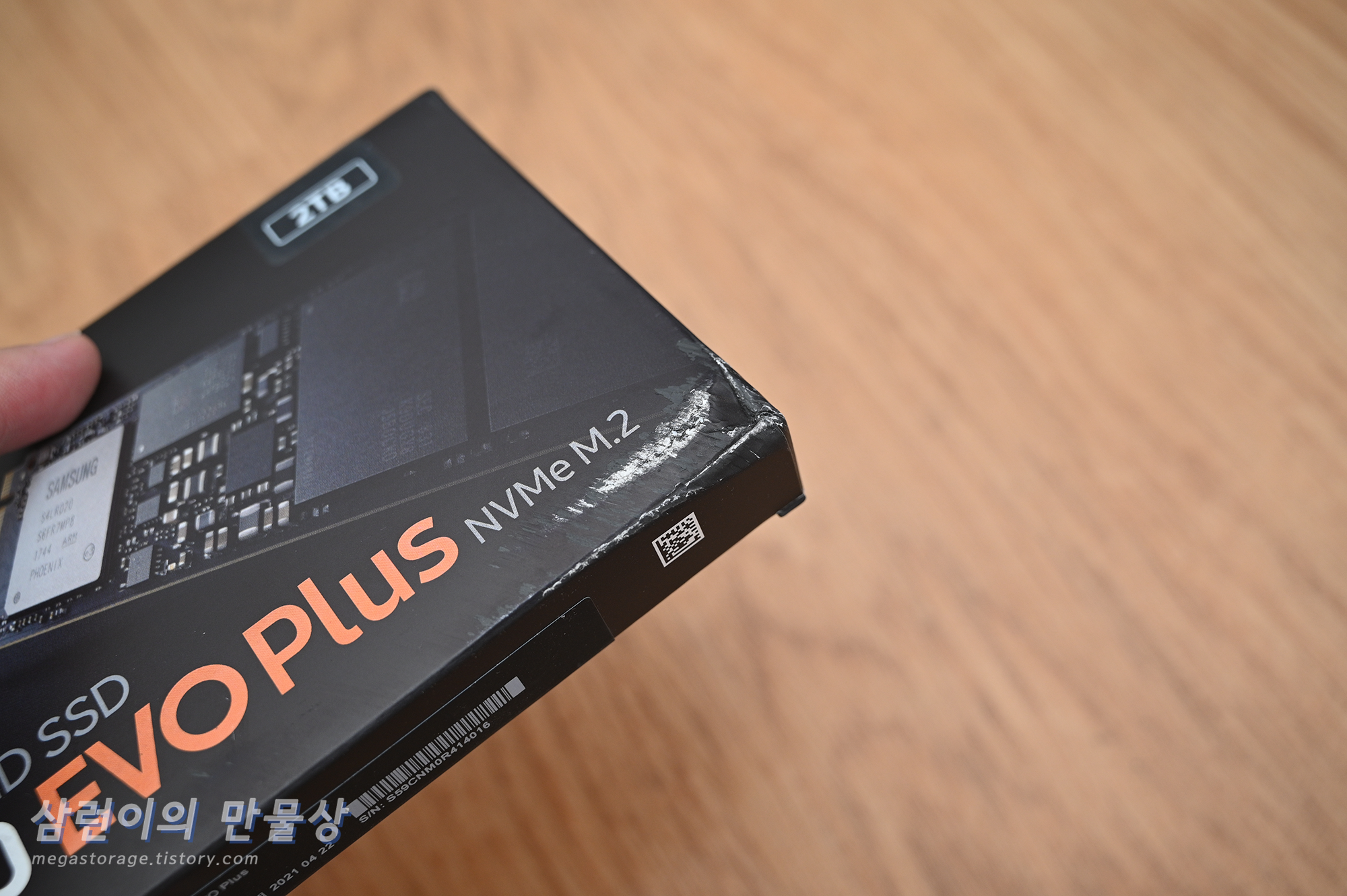 삼성 970 EVO Plus 2TB의 외관 박스입니다. 우측 하단에 뭔가 큰 찍힘이 있습니다.