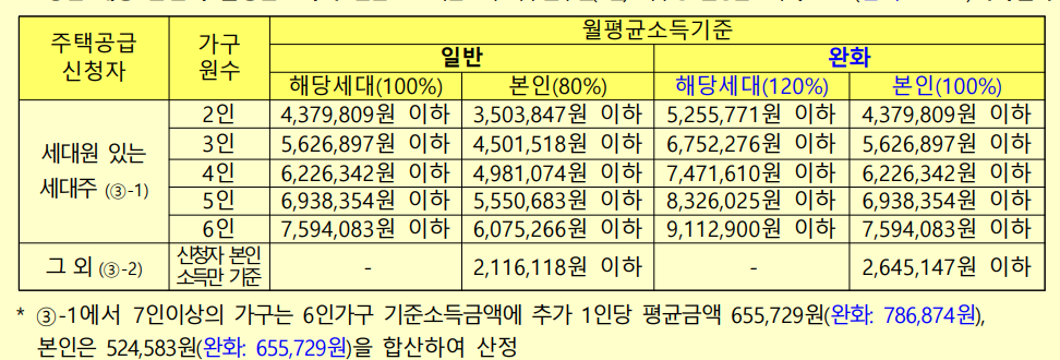 여기서 미달이 나서 추가 모집 공고를 하게 되면 '완화' 기준을 따르게 되는데, 보통 20% 정도 증가하게 됩니다. 1인 기준으로 완화된 월 평균 소득은 세전 2,645,147원이네요. 저는 처음에 저 금액이 세후 실수령 금액인 줄 알아서 신청만 하고 봤는데, 알고 보니까 세전 금액이네요. 망했습니다. 이 당시 연봉이 3,500만원이라서 이미 초과 된 상태였거든요.