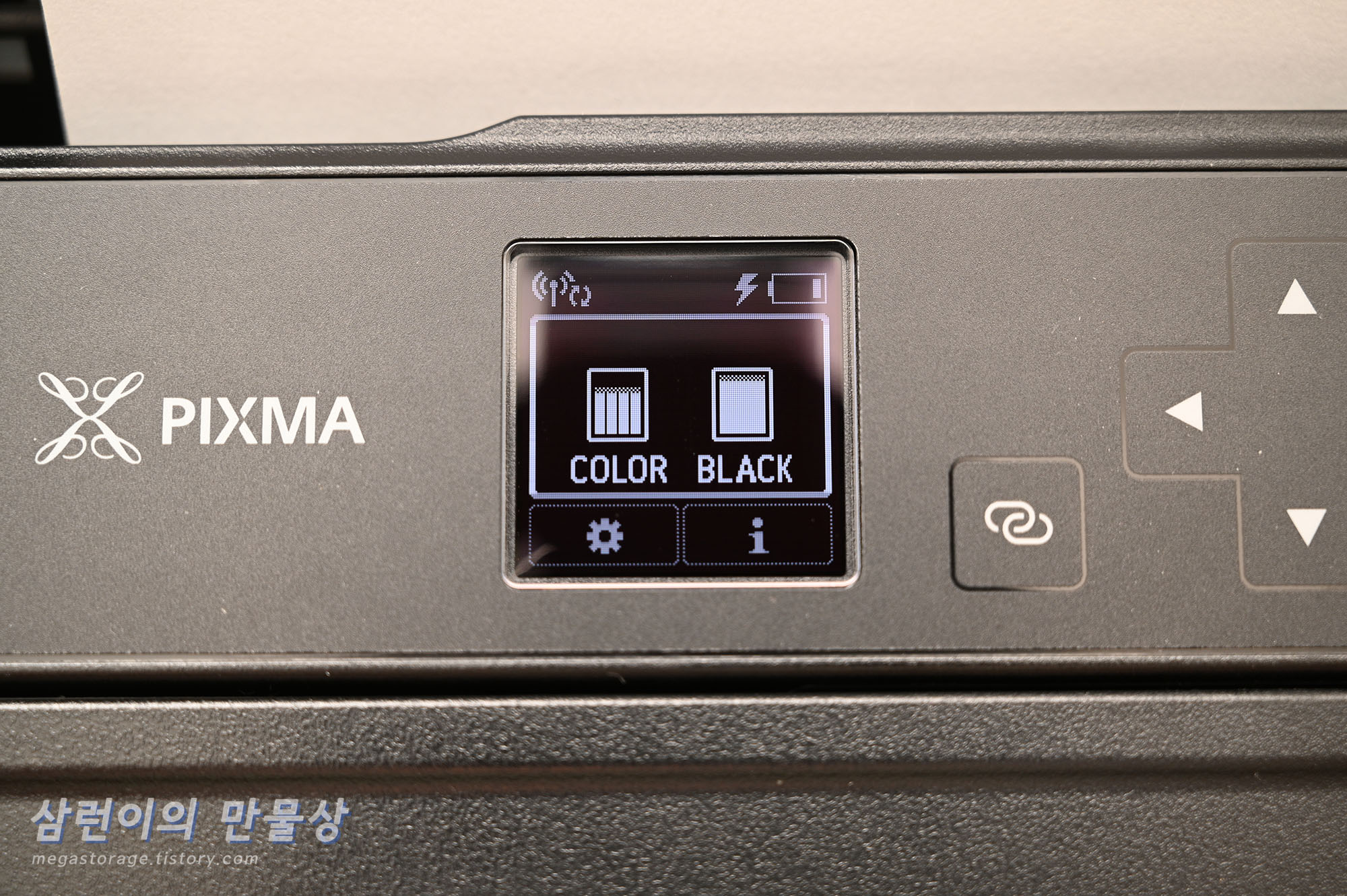 인쇄할 때 나타나는 TR150의 정보도 매우 간결합니다. 컬러와 흑백 잉크의 잔량은 한눈에 보기 쉽게 표현되어 있으며 LK-72 전용 배터리가 장착되어 있는 경우엔 배터리 잔량도 볼 수 있습니다.