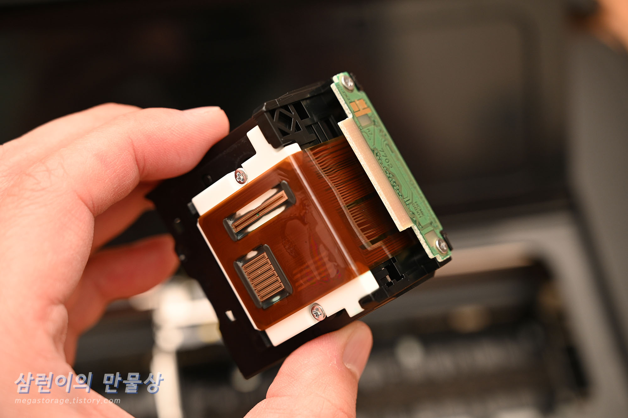 프린트 헤드는 이렇게 생겼습니다. 잉크 카트리지를 올리면 잉크가 새어나와서 아래쪽으로 공급되는 형태입니다.