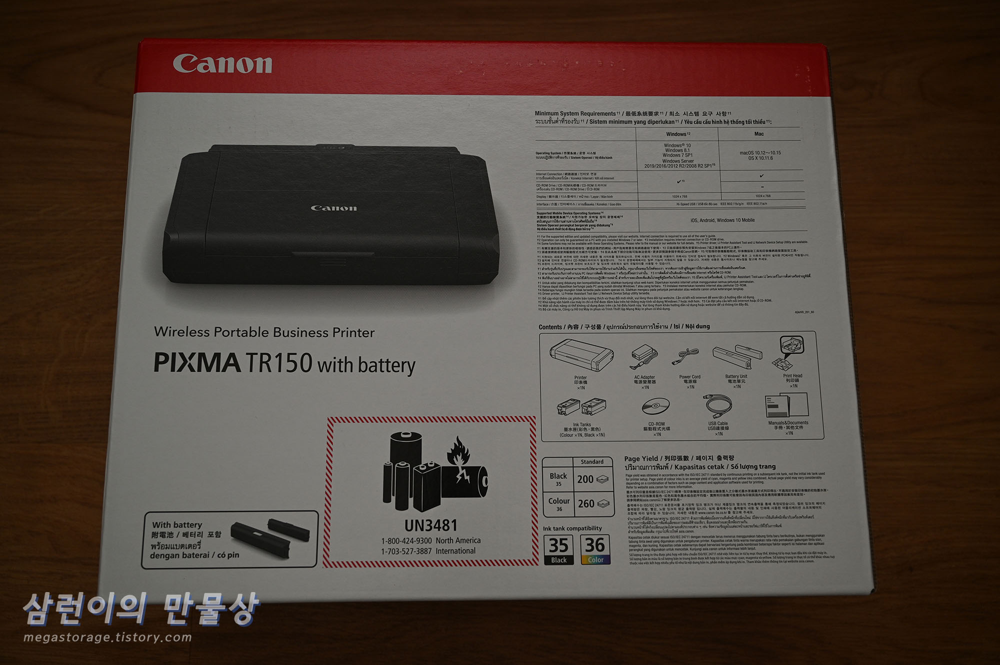 TR150의 후면에는 구성품, 잉크 종류와 기타 내용이 기재되어 있습니다.