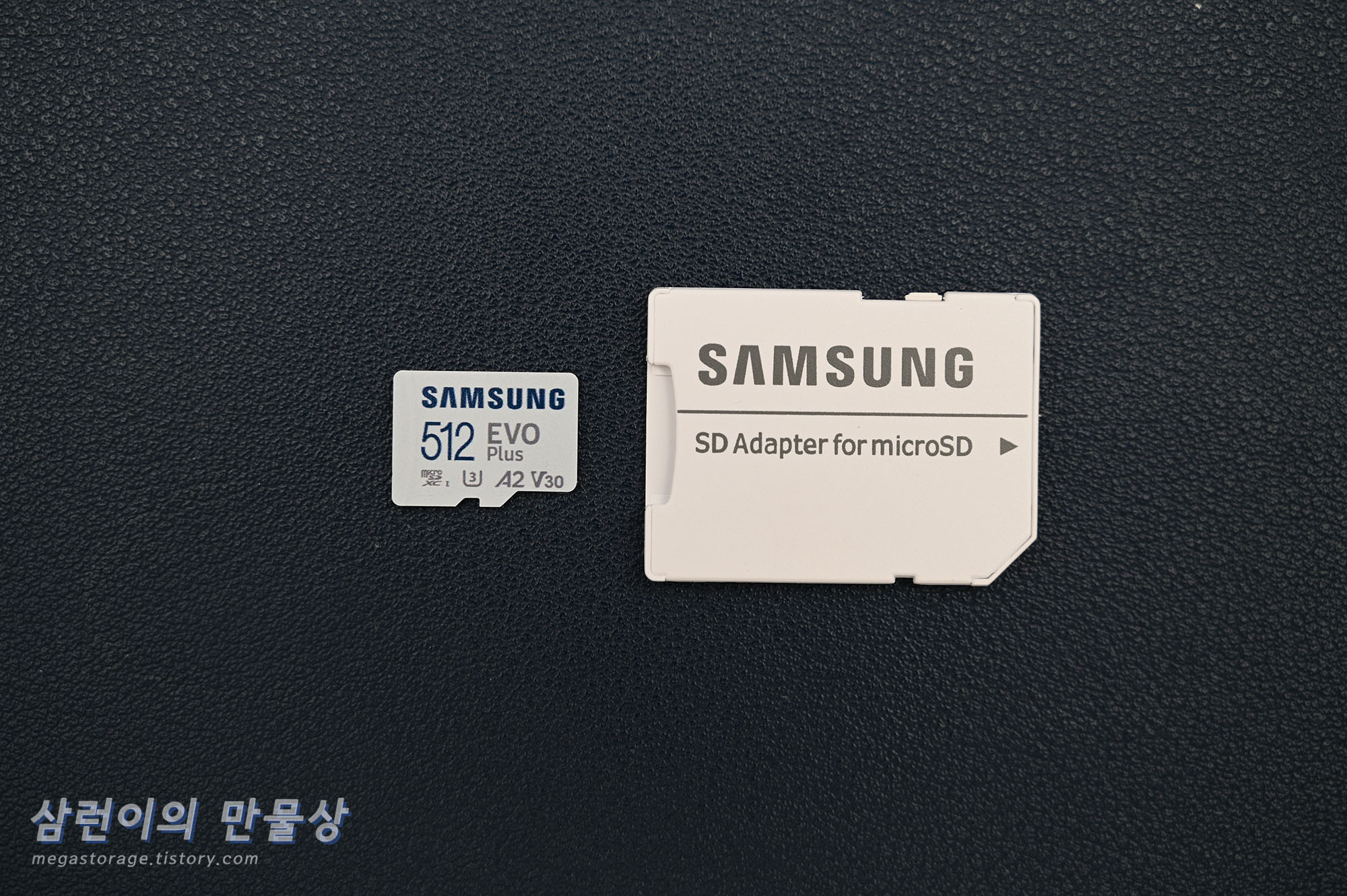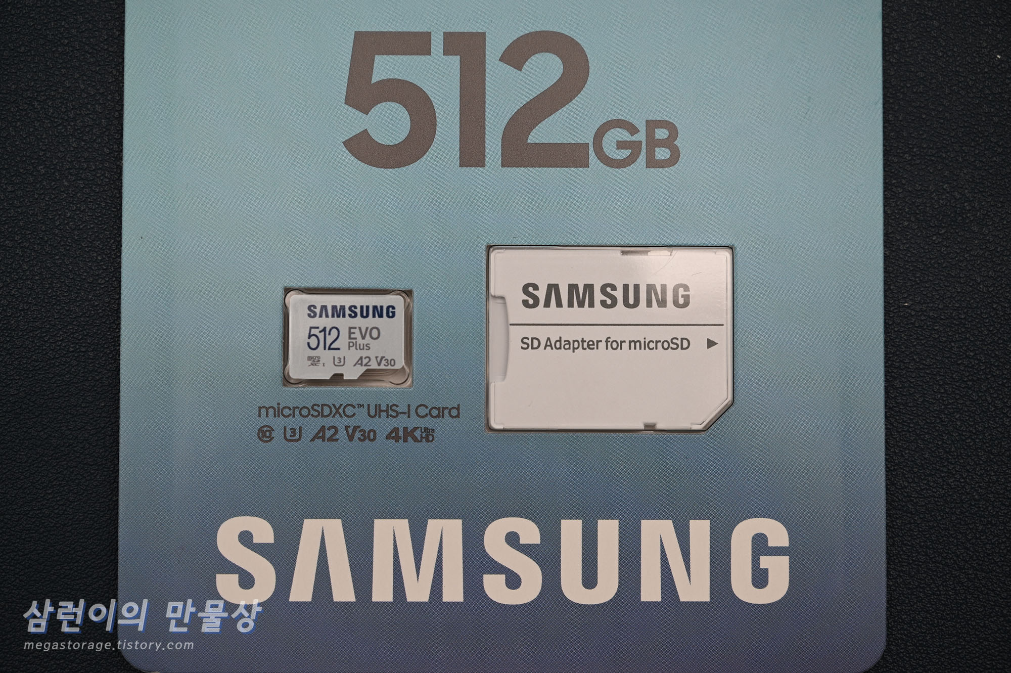 삼성전자 EVO Plus 512GB Micro SD 카드와 SD 아답터의 모습입니다.