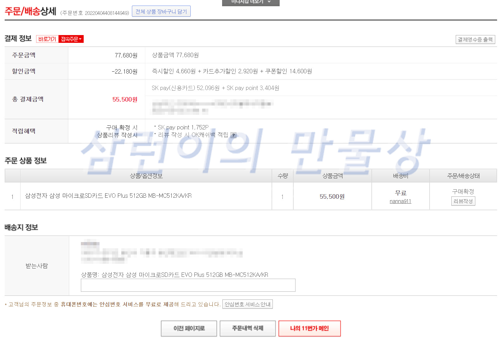 쿠폰 할인과 카드 할인을 모두 받아서 55,500원에 구매했습니다. 구매 확정 시 1,752 포인트를 주기 때문에 실제 체감가는 53,748원 입니다.