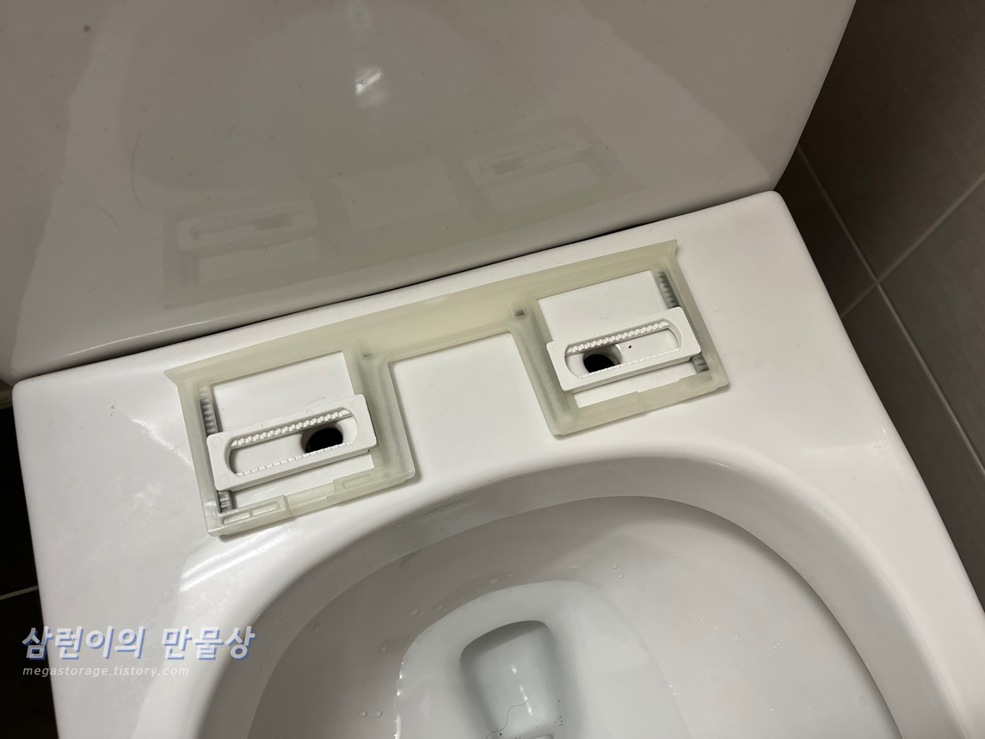 변기 아래쪽에 변기 커버를 고정하는 나사가 있습니다. 손으로 풀 수 있으므로 잘 풀어줍니다. 총 2개입니다.