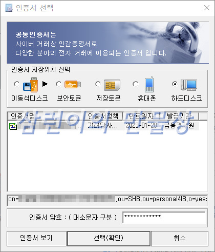 은행 사이트에서 발급받은 공동인증서가 필요합니다. (네이버, 패스, 그 외 공동 인증서 안 됨) 공동인증서로 로그인을 합니다.