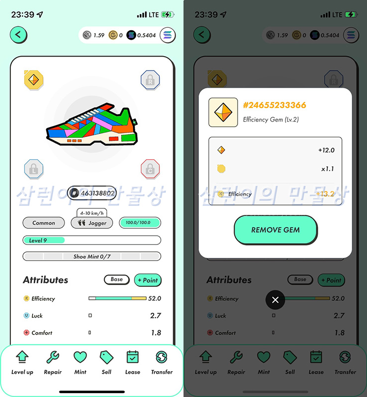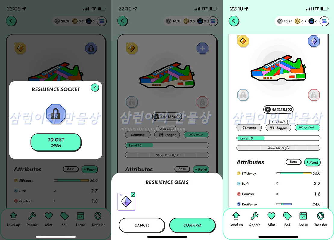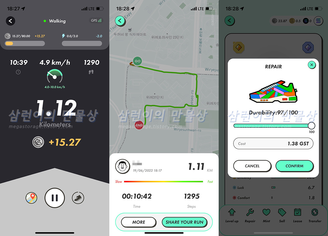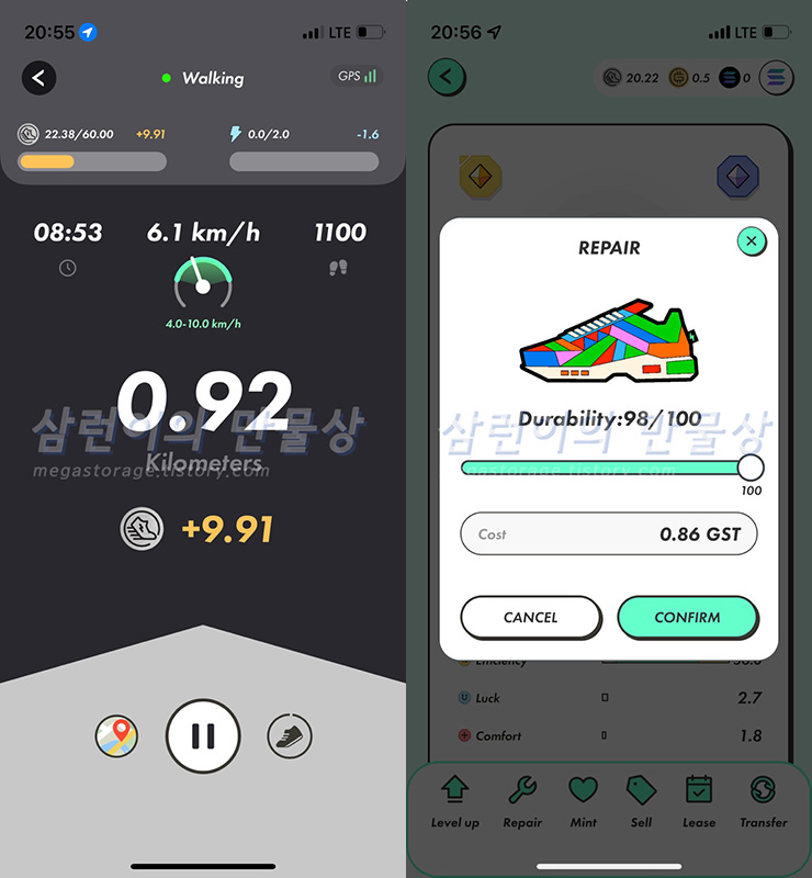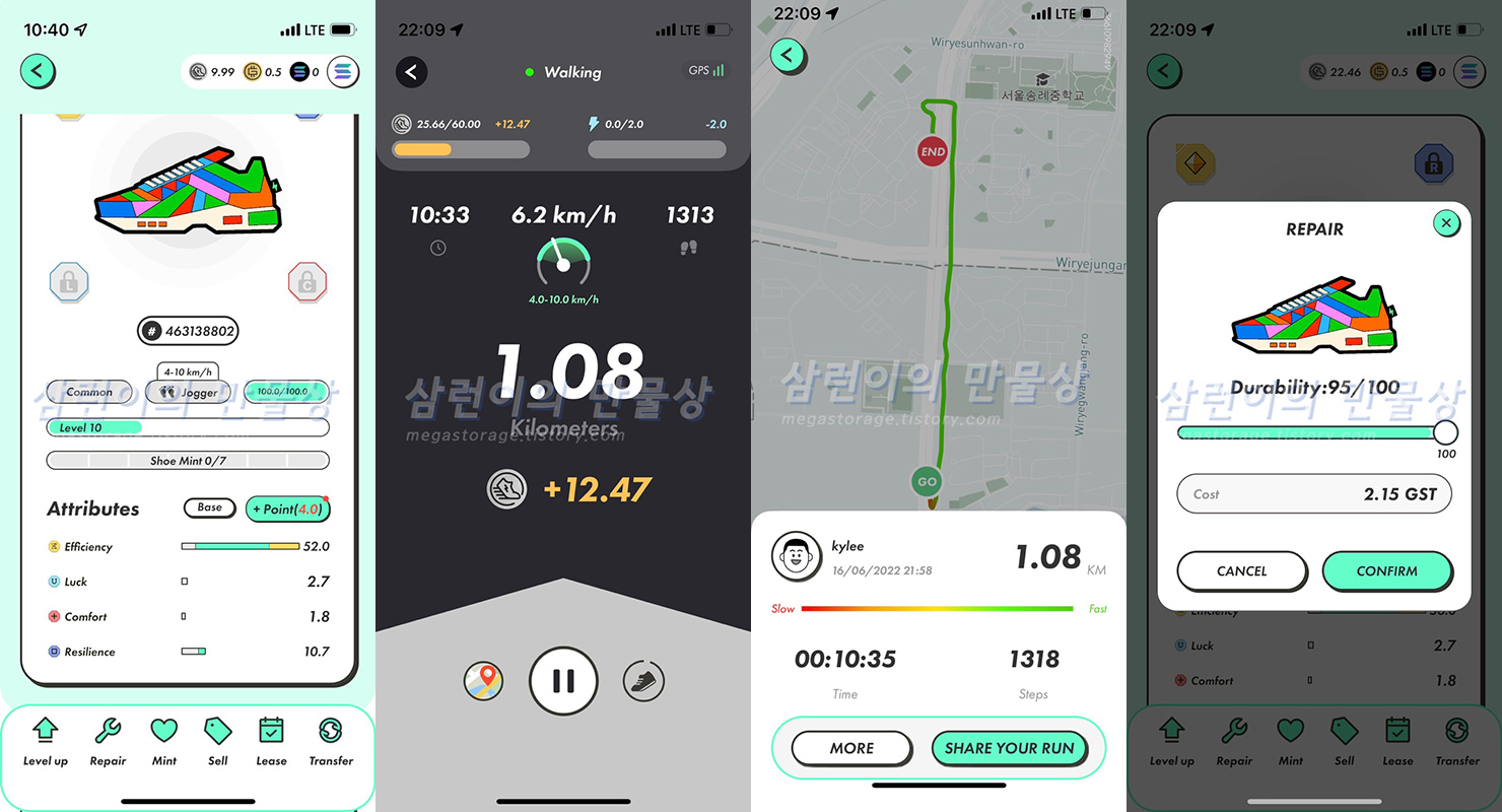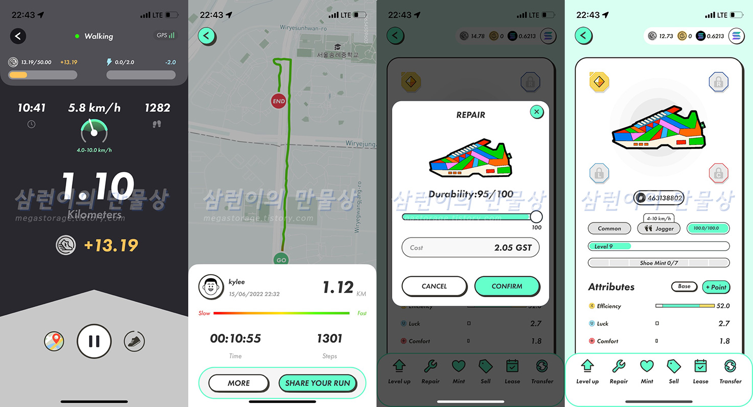 아무튼, 0.5 에너지를 소비해서 '2.78 GST'를 벌었습니다. 운동할 때 신발을 사용하게 되면, 신발의 내구도가 닳습니다. 내구도는 GST를 이용해서 수리할 수 있습니다. 운동 끝난 후 즉시 수리해두는 습관을 들이는 것이 좋습니다. 수리를 하지 않다가 내구도가 50% 미만으로 떨어지면 현재 신발의 효율성(Resilience) 값을 90% 수준으로 감소 시킵니다. 그리고 내구도가 10% 미만으로 떨어지면 효율성 값을 10% 수준으로 감소 시킵니다. 이 패널티는 영원하며 신발의 가치를 낮추는 것이므로 참고하세요.