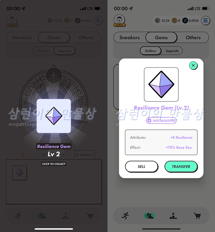 상점에서 레벨1 E젬을 3개(0.3 솔라나 * 3개 = 0.9 솔라나) 구입했으며, 지갑에 있는 솔라나를 이용해서 50 GST로 바꿨습니다. 그리고 강화를 시도 했는데, 띠용?! 한 방에 성공했습니다. 35% 확률을 뚫고 레벨2 E젬을 만들었습니다. 레벨2 E젬은 상점에서 3.4 솔라나에 구입할 수 있습니다. 0.9 솔라나 + 50 GST(0.5 솔라나)를 투자해서 3.4 솔라나를 만든 것입니다. 대박..