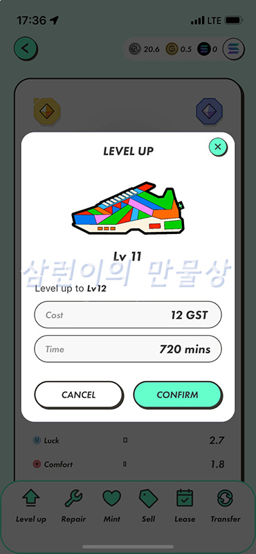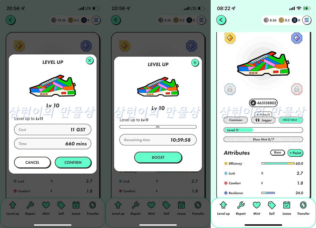 신발의 레벨을 업그레이드 할 때, 특정 레벨에서 GMT가 필요합니다.