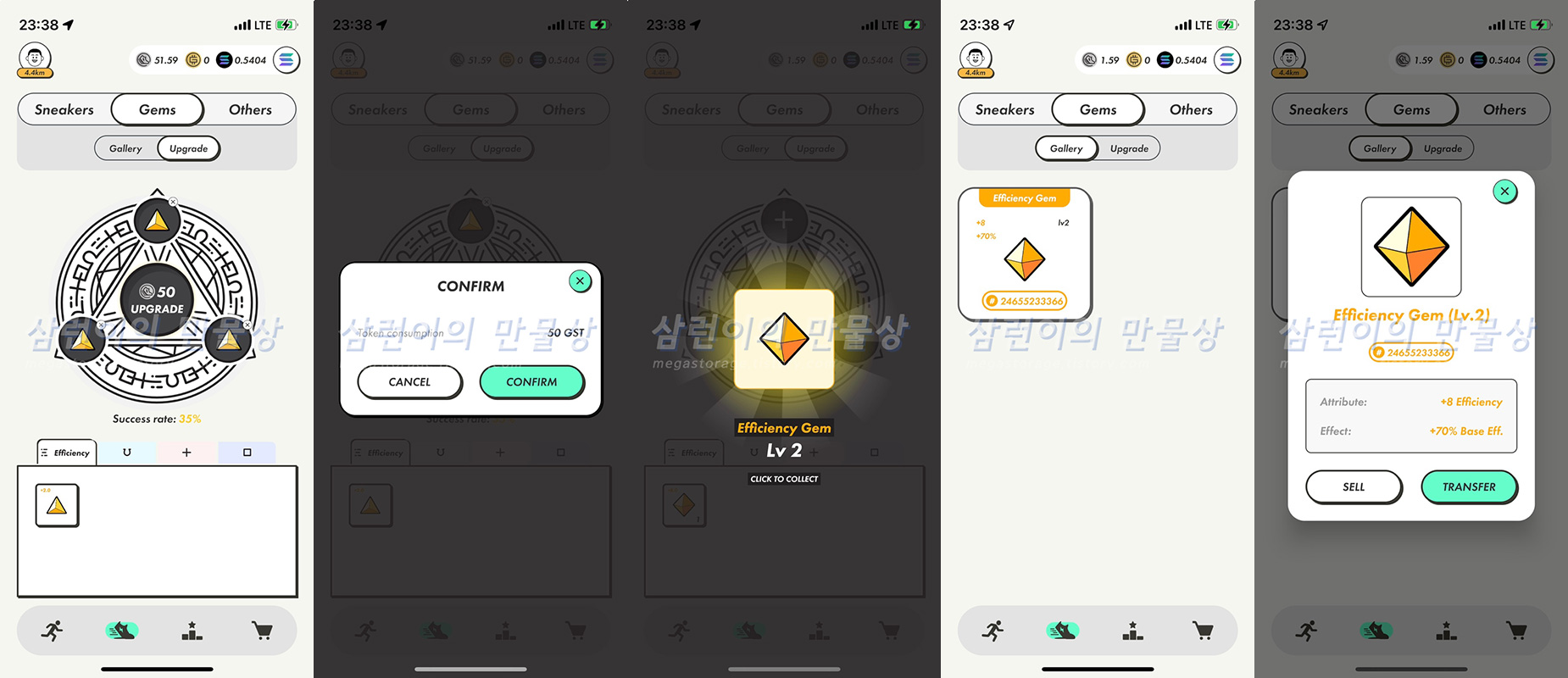 동일한 레벨의 젬 3개를 모으면 강화를 시도할 수 있습니다. 레벨1 젬을 3개 모아서 강화에 성공하면 레벨2 젬이 되는데, 이 때의 성공 확률은 35% 입니다. 그리고 50 GST가 필요합니다. 실패하면 젬이 모두 파괴되며 50 GST는 환불이 되지 않습니다.