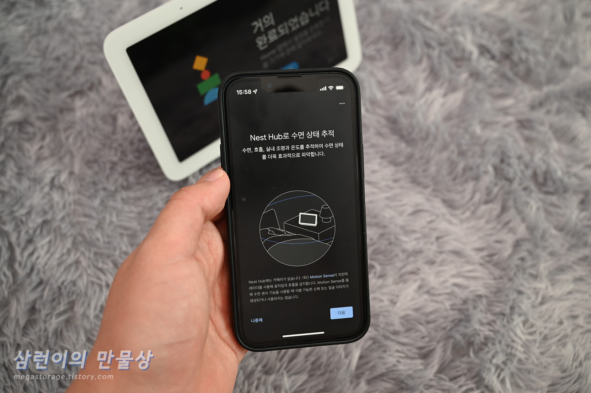 스마트폰을 구글 네스트 허브 2세대와 가까이 두면, 자동으로 찾아냅니다. 그리고 설정하겠냐고 물어보면, 당연히 '다음'을 눌러야 합니다.