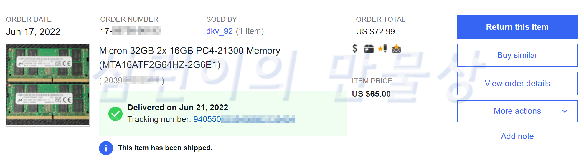 램은 이베이에서 마이크론 DDR4 PC-2666V 16GB 2개(총 32GB)를 72.99달러에 구입했습니다. 배대지 배송비 다 합치면 11만원 정도 됩니다.