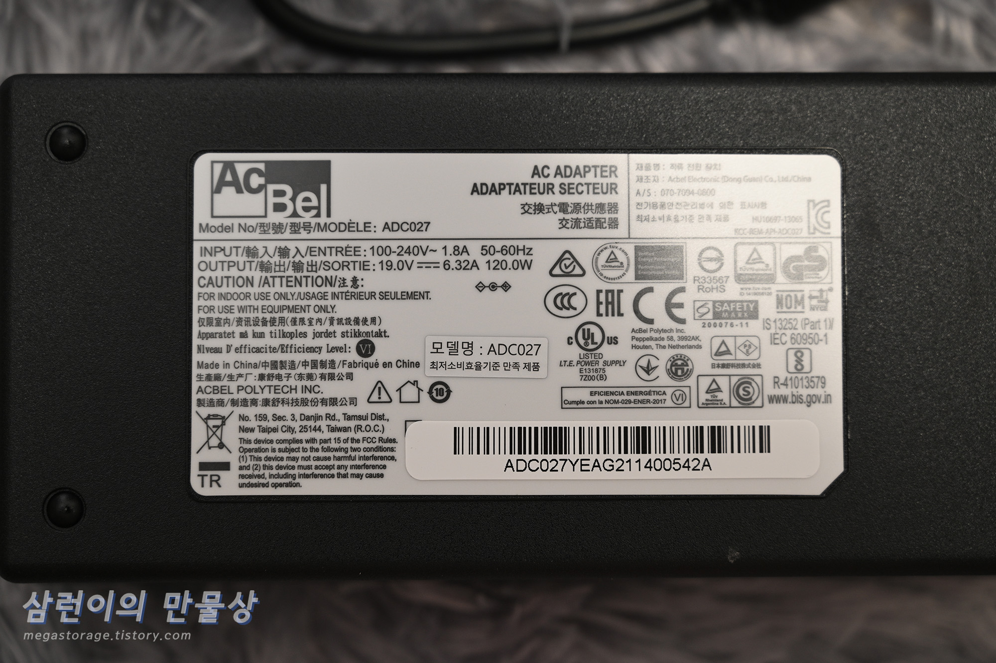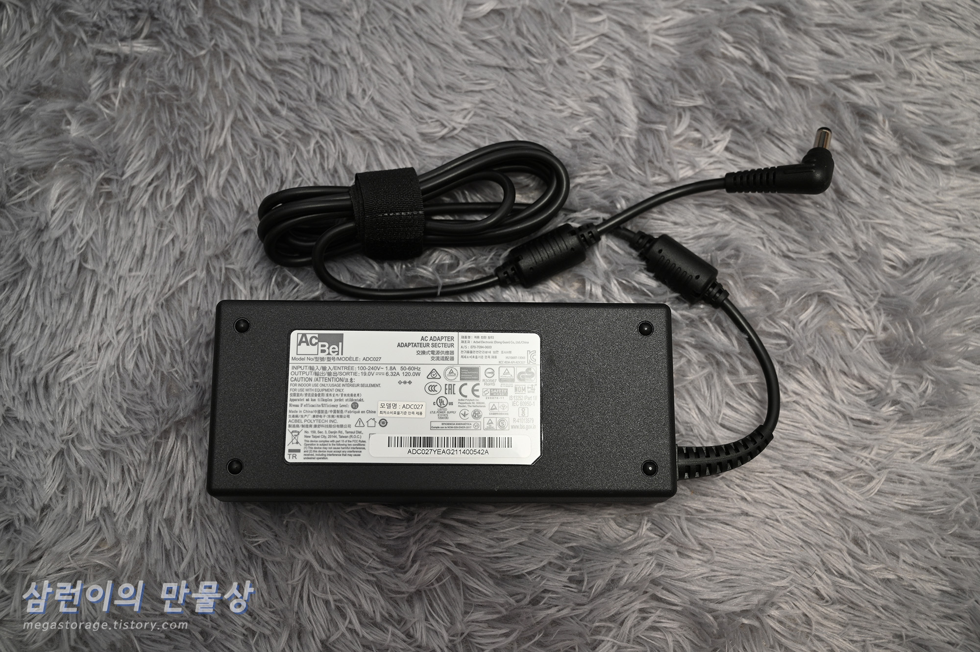 전원 아답터는 19V @ 6.32A 스펙으로 총 120W 출력을 내어줍니다.