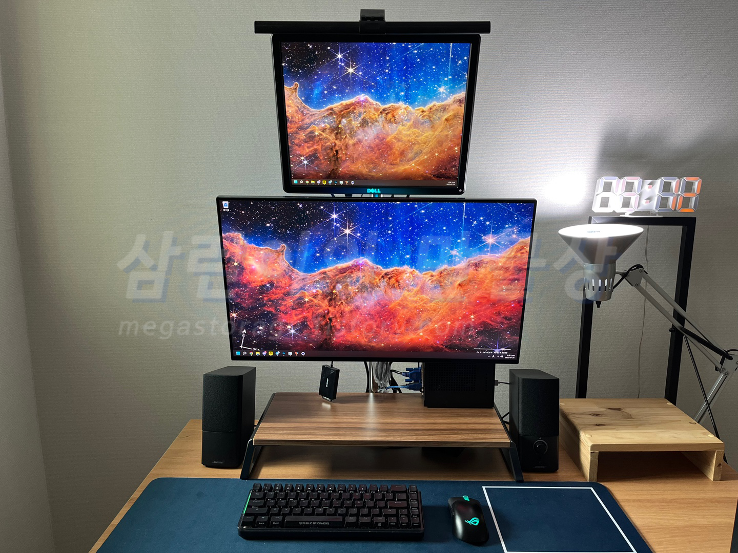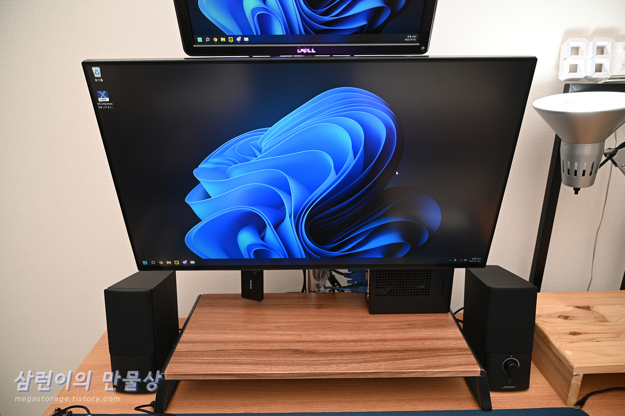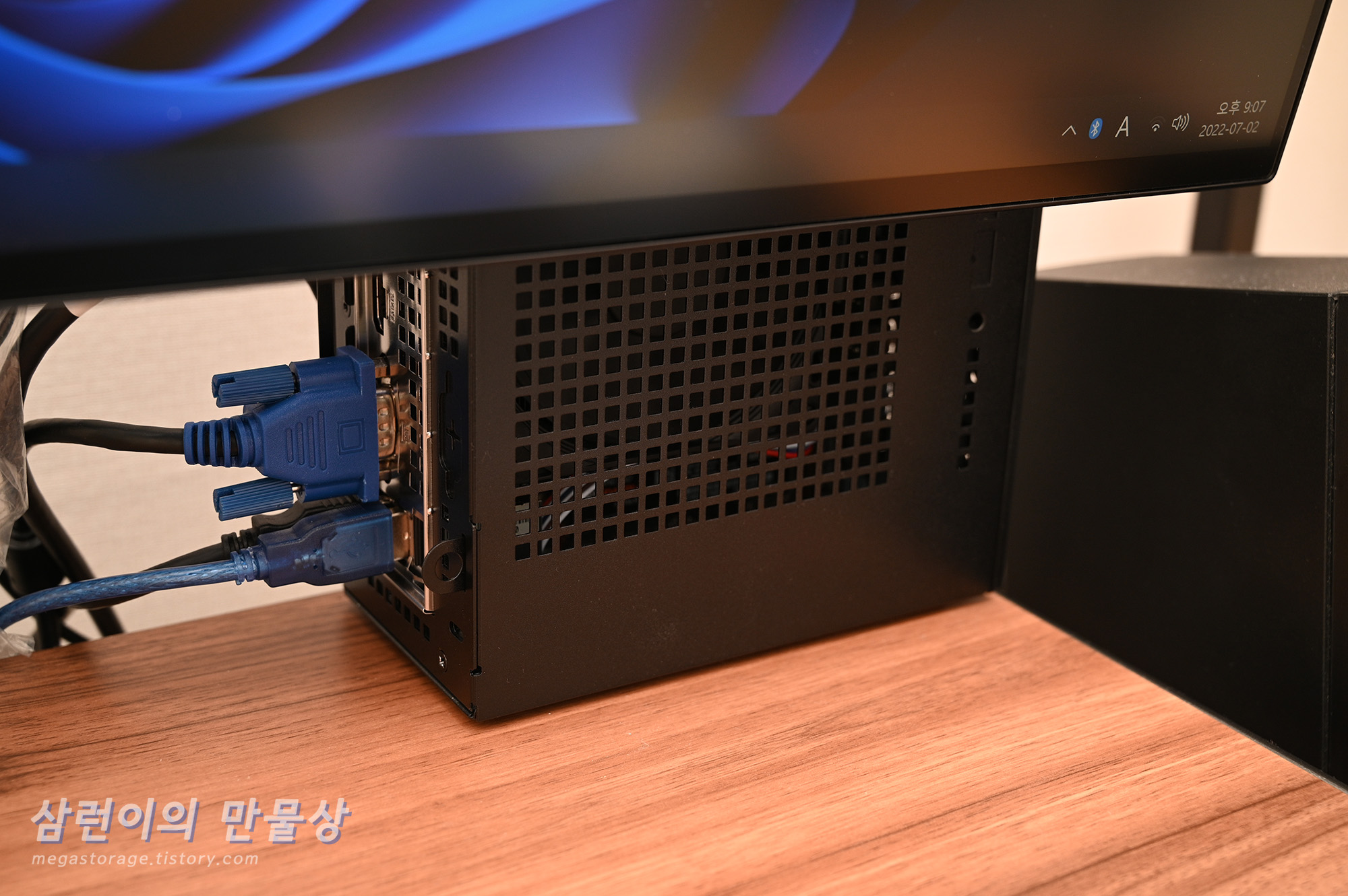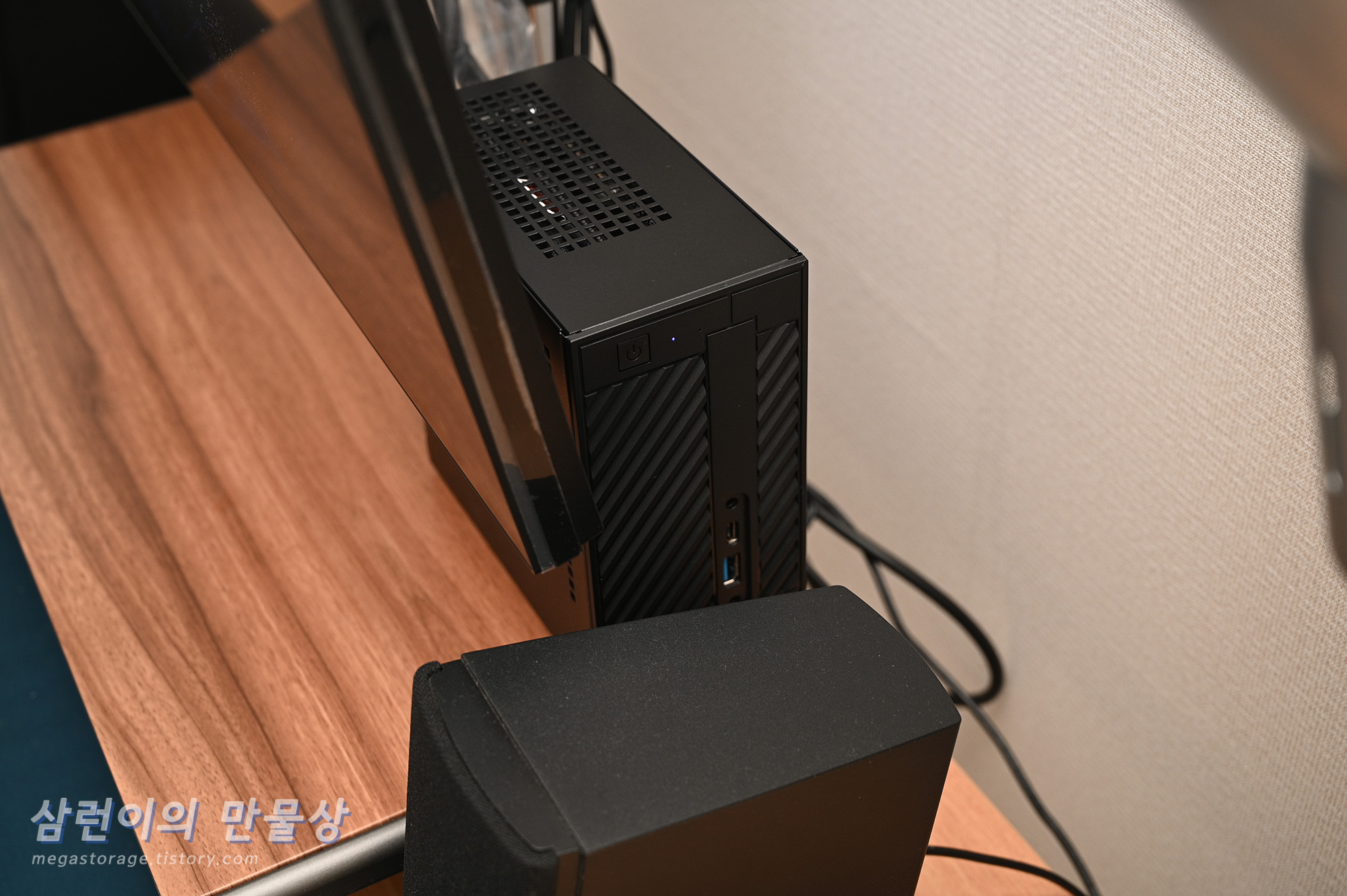 모니터 뒤쪽에 숨겼습니다. 책상에서 큰 공간을 차지하지 않으니 마음에 듭니다.