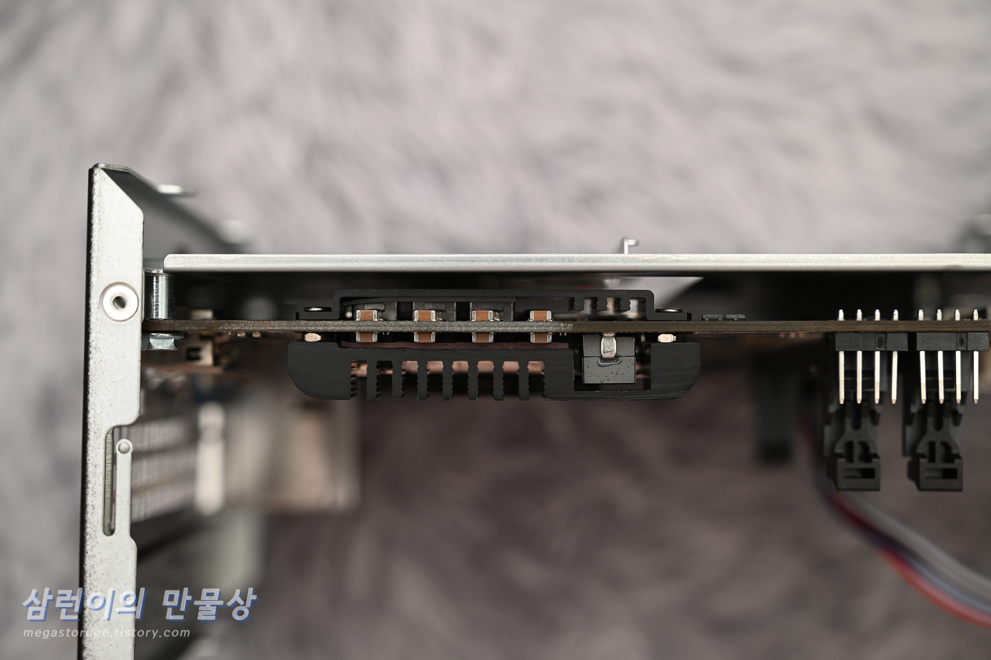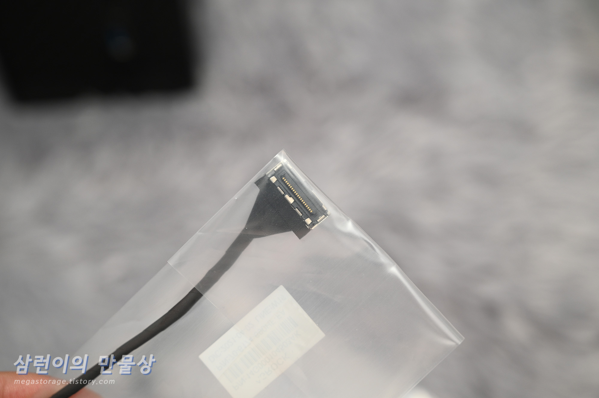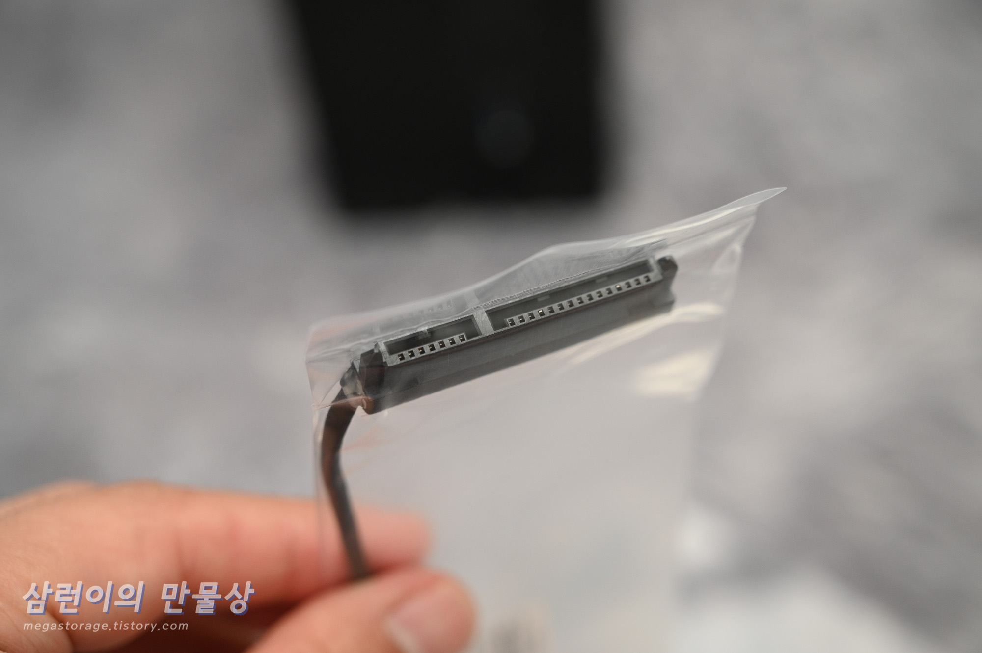 케이스와 메인보드 구조 특성상 일반적인 SATA 케이블이 아니라 커스텀된 SATA 케이블입니다. 마치 노트북의 SATA 케이블 같은 느낌입니다.