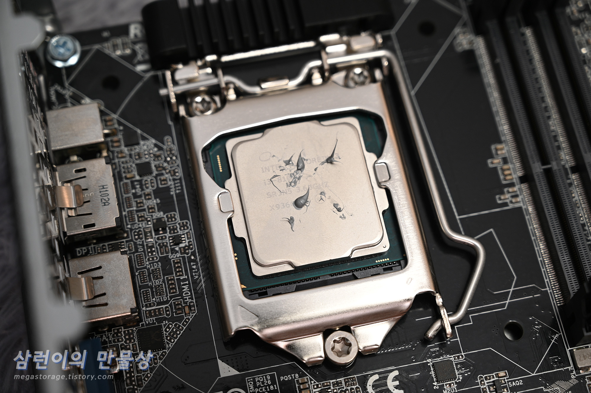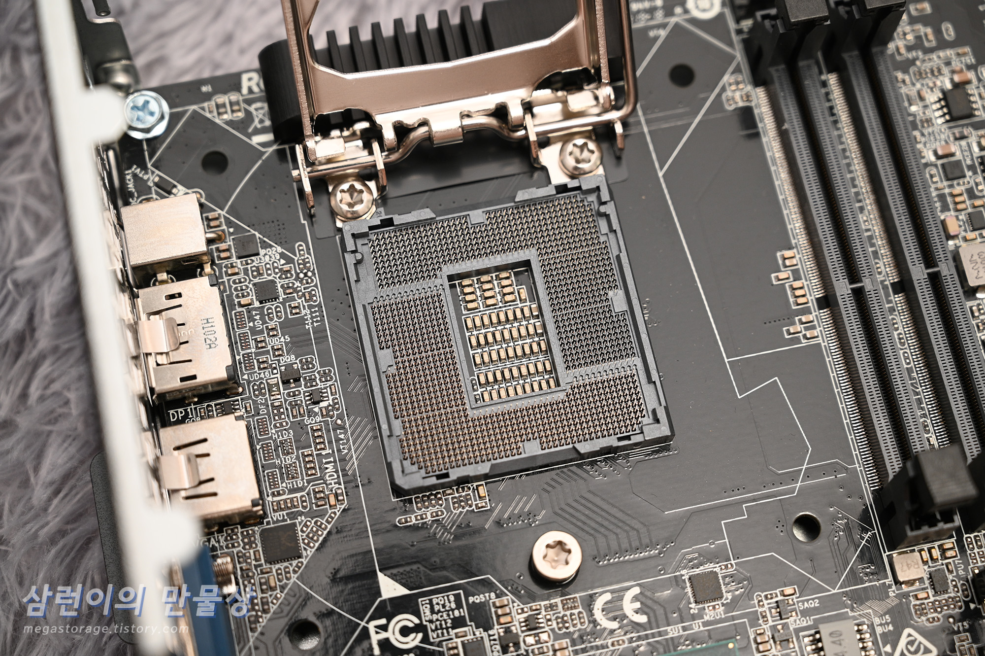 먼저 CPU를 장착합니다. 메인보드의 CPU 고정 걸쇠를 들어올립니다. 인텔 CPU라서 핀들이 메인보드에 붙어있습니다. 이 핀들이 휘어지지 않도록 CPU를 잘 올려놓습니다.